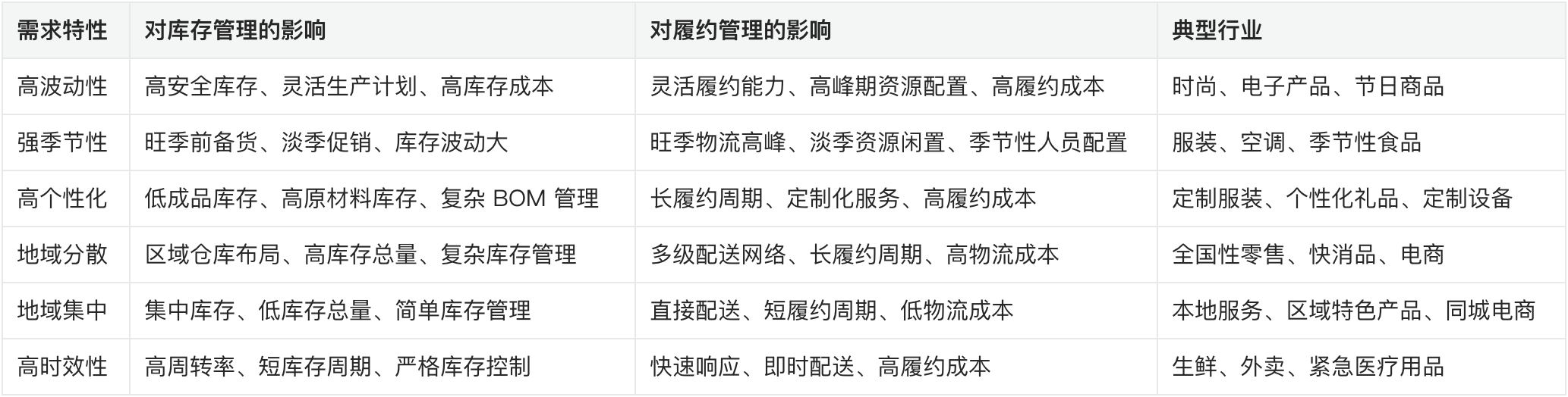 - 季节性导致库存和履约的周期性变化。季节性强的行业如服装、空调等通常在旺季前增加库存,并在淡季进行促销以减少库存。同时,季节性需求也影响履约能力的配置,如增加临时人员和设备以应对高峰期。