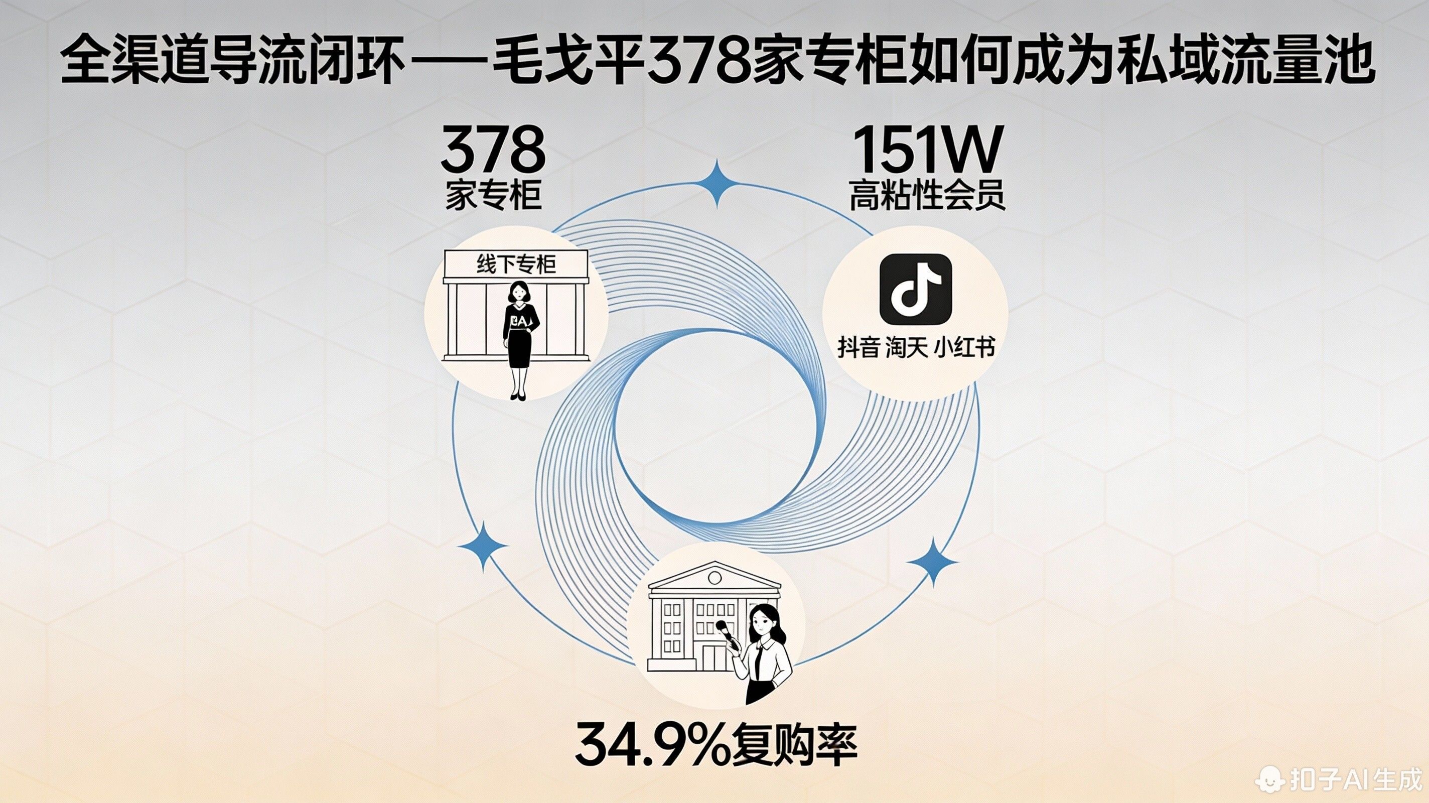 毛戈平378家专柜能成为私域流量池,核心在于搭建了一套“线上-线下-生态”互通的全渠道导流闭环——专柜是整个闭环的枢纽,承接各链路流量、沉淀为私域资产后,再反哺全渠道转化,形成“引流-沉淀-激活-复购”的自循环。