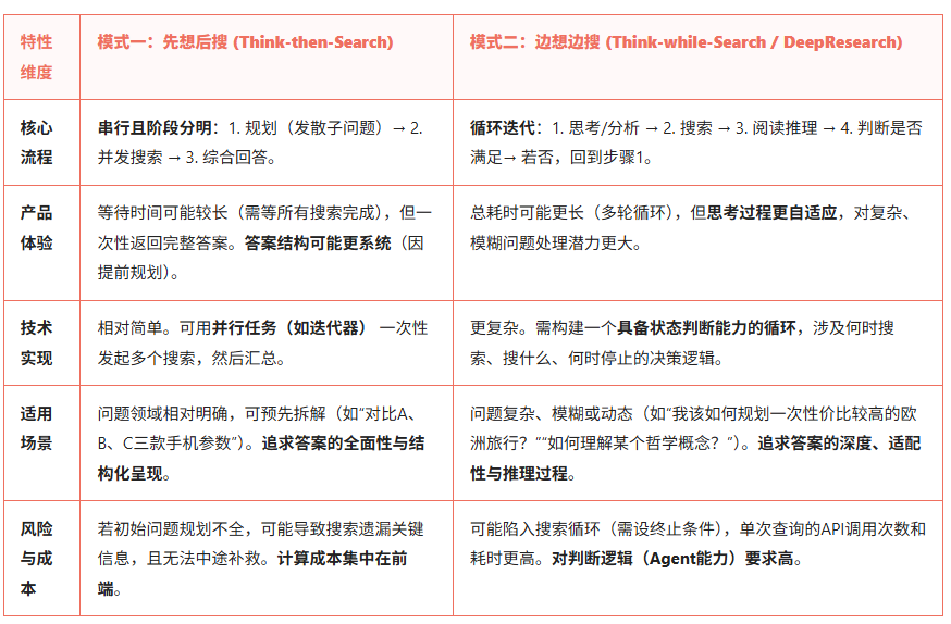 核心洞察:两种模式并非简单的优劣之分,而是在“确定性”与“灵活性”光谱上的不同选择。“先想后搜”试图通过前期周密的计划(确定性)来提升效率;“边想边搜”则承认复杂问题的不可完全预知性,通过赋予AI动态调整的灵活性来追求更优解。