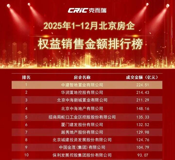 根据CRIC克而瑞公布的2025年北京房企销售排行榜,在权益销售金额排行榜上,中建智地以224.51亿元的业绩登顶,华润置地、中海新城以214.43亿、211.29亿元分列二、三名。