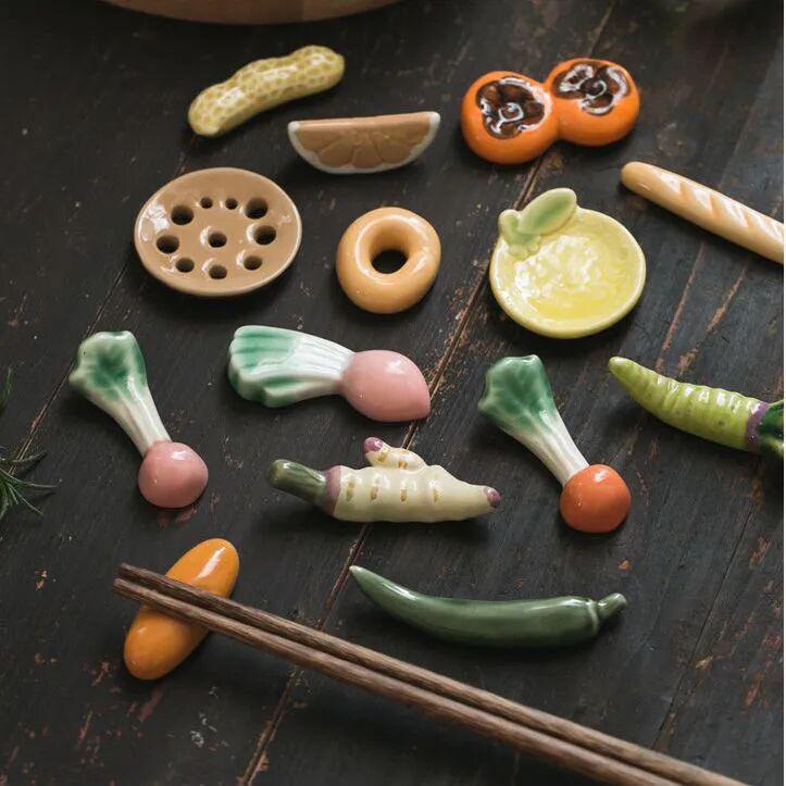 筷子总滚来滚去,沾到桌子?看看这,辣椒、蘑菇、茄子……一套可可爱爱的蔬菜筷托!陶瓷材质好清洗,吃饭时筷子有了小窝,餐桌瞬间生动起来。