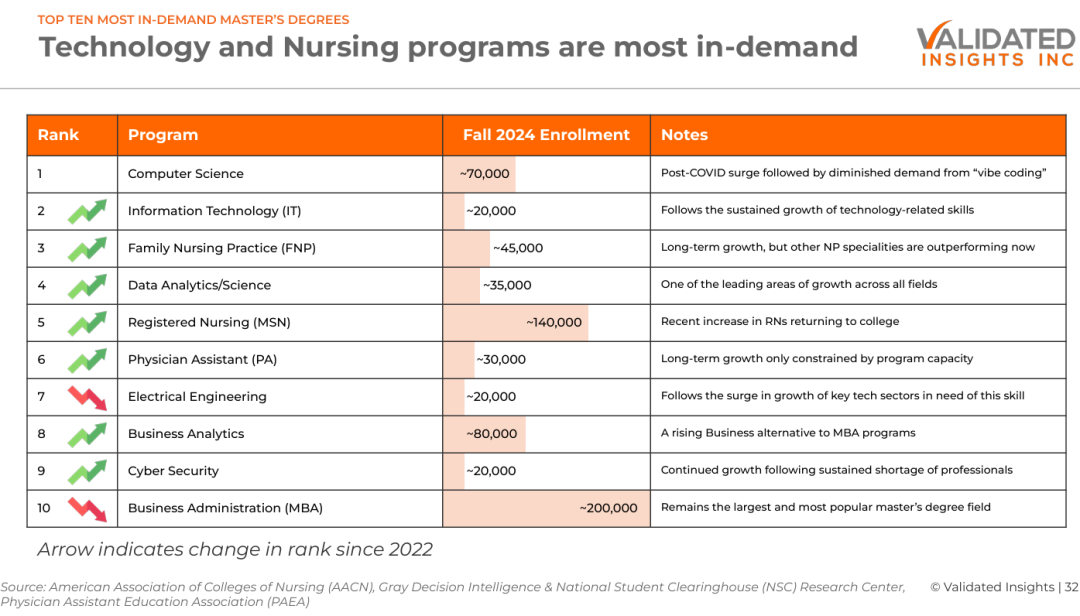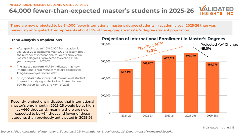 该报告由高等教育市场研究机构Validated Insights发布,综合了多个行业组织的数据。报告指出,围绕移民政策和留美工作的不确定性,已成为国际硕士生人数下滑的主要原因之一。