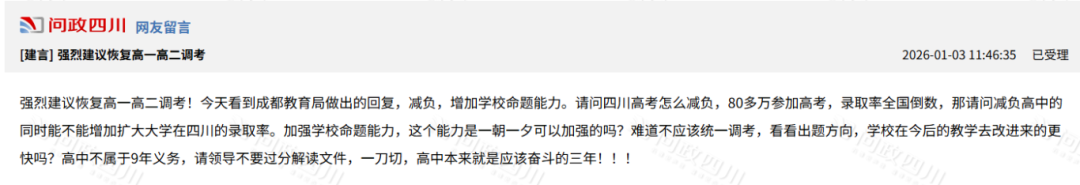 近日,成都取消高一、高二全市统一调研考试的通知一出,让不少高中家长坐不住了。许多家长通过“问政四川”等平台接连发声,焦虑之余也集体呼吁恢复统考。
