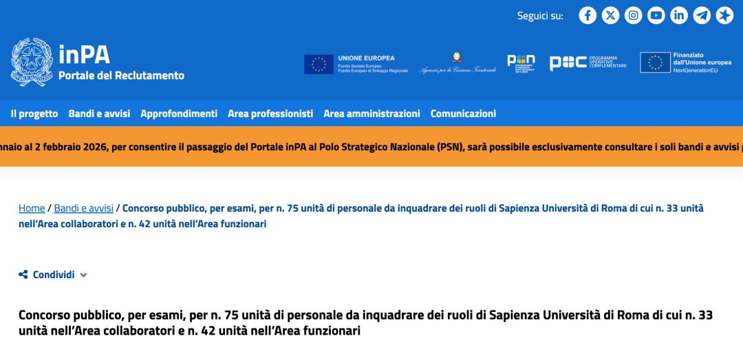 申请截止日期因招聘渠道而异。有意通过Ripam系统申请的候选人,需在2026年1月27日前通过意大利公共行政数字平台(InPa)提交申请,并支付10欧元的参与费。而对于学生指导、国际化和学生秘书处这三类专家职位的申请,则须于2026年1月21日前通过经过认证的电子邮件(PEC)提交。