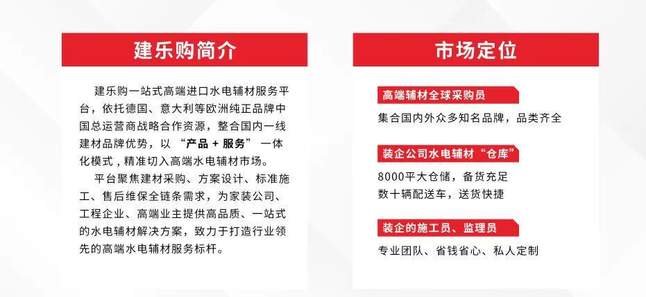 建乐购仓配与以德国、意大利为主的众多欧洲纯正品牌的中国总运营商战略合作,并联合国内一线品牌,成立了“建乐购站式高端进口水电辅材服务平台”,公司集材料配送/设计/施工/售后等一系列产品及整体服务体系。