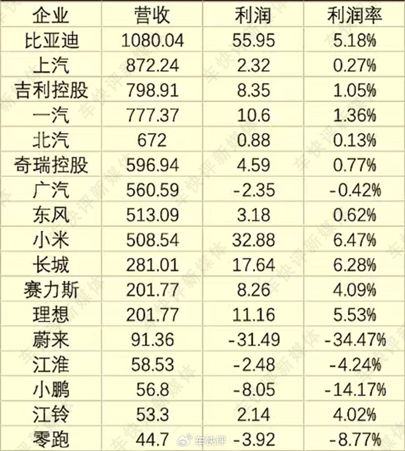 除了上述两个原因,汽车行业产能过剩,对车市健康有序的发展也会起到一定的负面作用。下图是国内主要车企的营收和利润对比,感兴趣可以自己研究一下。