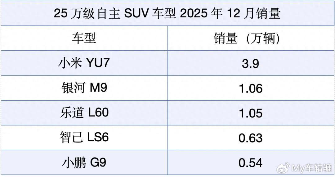那么,这几款车型的月销量表现如何?以2025年12月销量为例,官方给出的数据显示,小米YU7遥遥领先,单月销量逼近4万辆,超越同级车型一大截。尽管小米和雷军遭遇网络两极化评价,但从目前来看,小米YU7的订单量还是相当乐观的。按照计划,小米汽车还将在今年推出一款全新SUV,新车或为小米YU9。