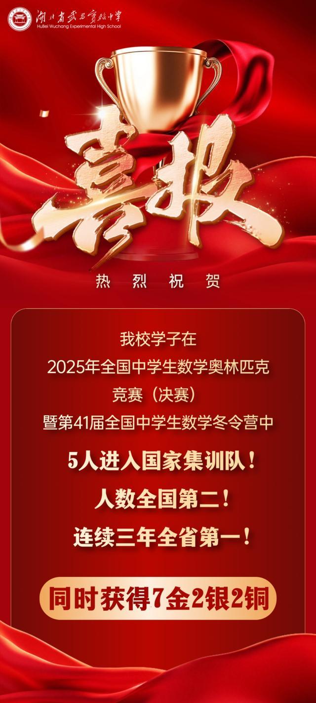 2025年,我校数学竞赛再度强势发挥:5人入选国家集训队,人数居全国第二、全省第一,连续三年蝉联省赛金牌与国集人数“双第一”!共收获7金2银2铜,续写辉煌篇章。