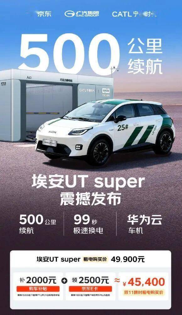 京东、广汽与宁德时代联手打造的埃安UT super近日正式公布价格,其电池租用方案起售价为4.99万元。通过叠加地方购车补贴及京东E卡专属优惠,PLUS会员购车门槛可进一步下探至4.54万元。这款被定位为“国民好车”的车型,凭借创新能源模式与越级空间表现引发市场关注。