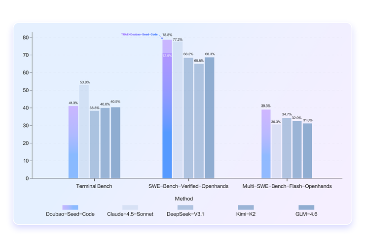 豆包编程模型通过大规模Agent强化学习训练,在真实编程场景中效果出色,且展现出良好的泛化能力。与TRAE开发环境深度结合后,豆包编程模型在SWE-Bench Verified榜单中以78.8%的得分达到业界最佳水平,充分验证了模型与工具深度适配后的协同效应。