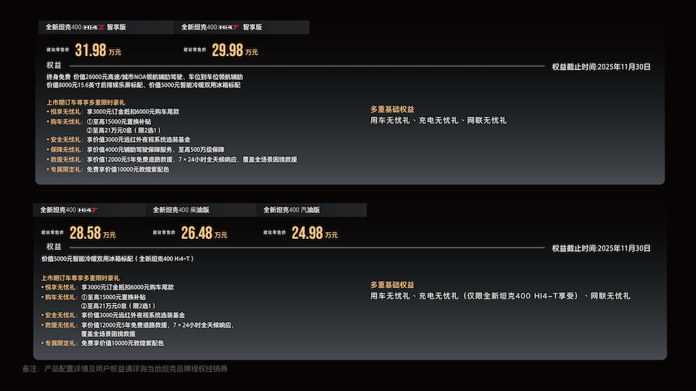 11月10日消息,日前,全新坦克400(配置|询价)正式上市,其中,汽油版车型指导价为24.98万元,柴油版车型指导价为26.48万元,Hi4-T标准版指导价为28.58万元,Hi4-T智享版指导价为29.98万元,Hi4-Z智享版指导价为31.98万元。