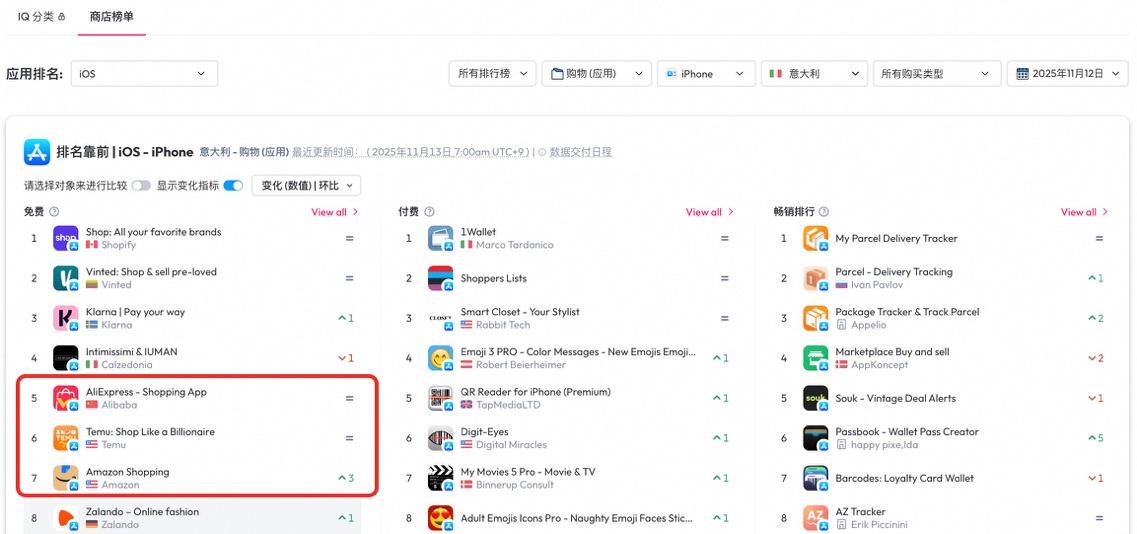 据iOS应用商店数据,海外双11首日,速卖通在西班牙、英国、巴西、日本、意大利等多国下载榜已超过亚马逊。