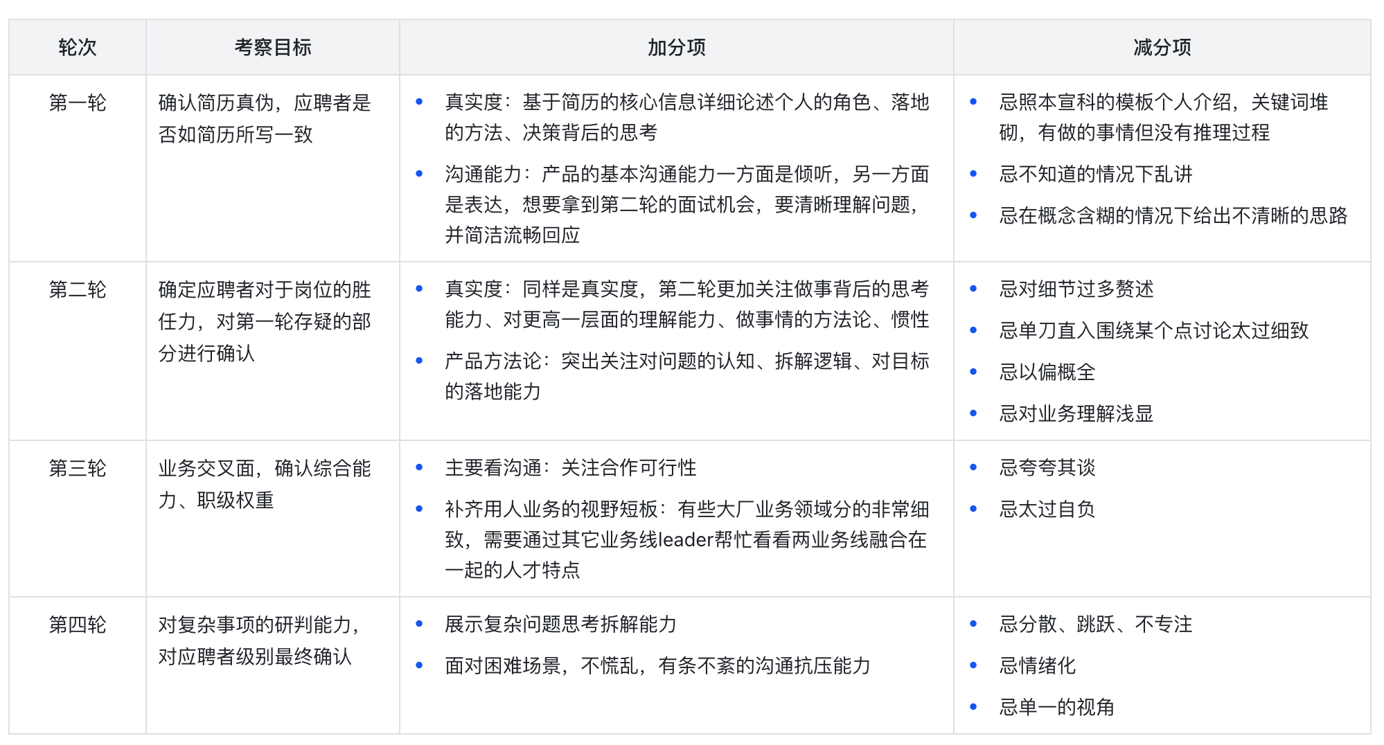 - 第三轮——交叉面,有可能是合作密切的其它产品侧同学,如果非常偏策略,有可能面数分团队的leader或者算法团队的leader。交叉面的原则不会挂人,但结论是重要判断职级的依据,因此尽可能表现自己的专业度跟做策略的视野非常重要