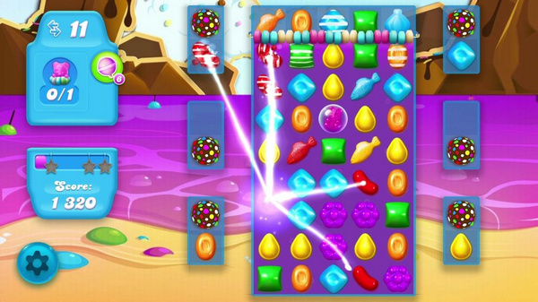 首先需要通过交换两个相邻的糖果来使三个或更多相同颜色的糖果拍成一行或一列来进行消除并得分,接着可以通过消除四个或以上的糖果来制造出具有强大消除能力的特殊道具,最后还引入了苏打水以便在水中的糖果会向上漂浮,同时还需要在有限步数内通过消除糖果和障碍物来完成特定的目标关卡。