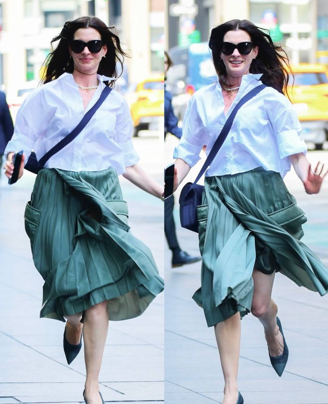 最新一套露出的造型中,她身穿的是来自Sacai的白色衬衫和绿色百褶裙,简约干净但也不乏设计感。墨镜、项链等配饰的装饰,也会让造型更精致一些。