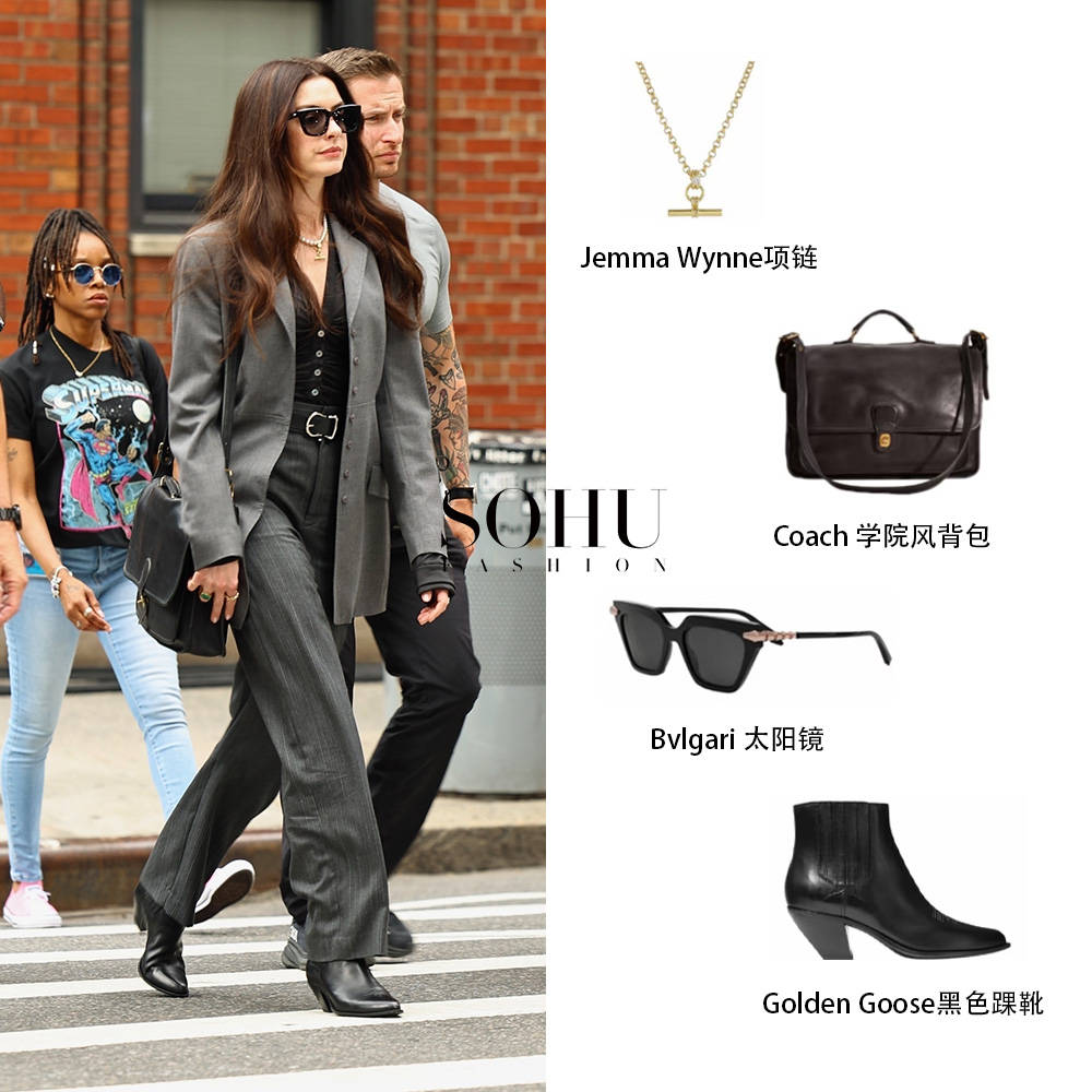 灰色西服套装气场十足,简约大方又洒脱,高挑的身材把这套驾驭得很完美,简中带繁,衣服简单配饰就不简单,Jemma Wynne的项链刚好点睛,宝格丽帅朗的太阳镜与西装很好的匹配,利落潇洒。