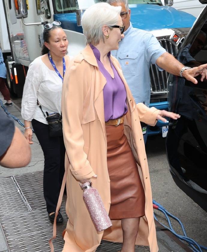 路透的几套造型依旧霸气,来自Lanvin的裸色风衣、紫色内搭、棕色皮裙搭配GUCCI的高跟鞋,现身纽约街头,手上不再是咖啡杯,而是一个贴水钻的保温杯,还有她标志性的墨镜,气场全开。
