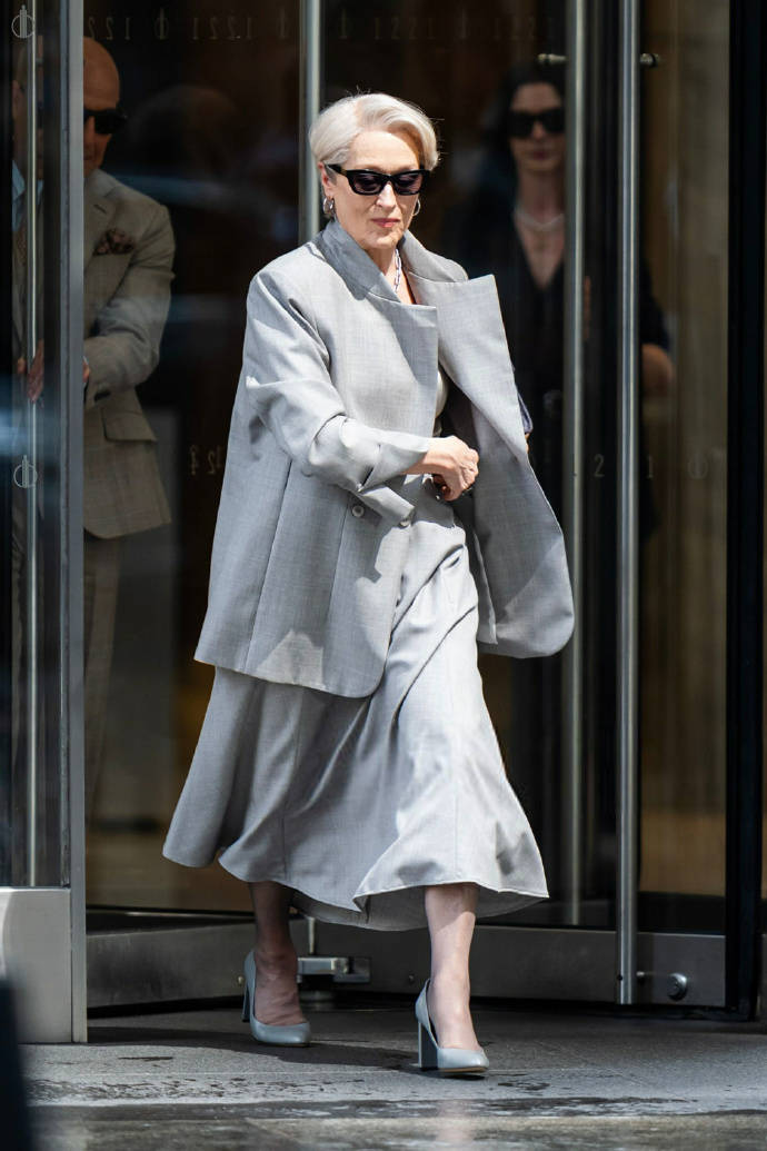 Miranda这一身Sasuphi的灰色西装配裙装很精准到位,既符合她职场精英的干练形象,Jimmy Choo的墨镜、TODS的腰带、等首饰搭配又有时尚行业的时髦度,整体突显出女魔头强大的气场!