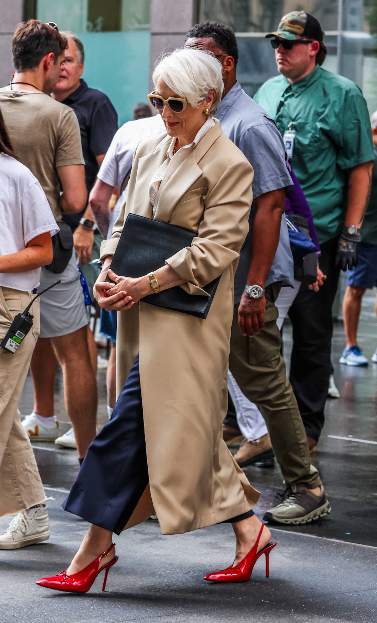 Miranda每天的造型不同,穿的单品也不重复,这次女魔头穿Jacquemus红色高跟鞋非常亮眼,Sasuphi的驼色大衣搭配Maxmara的阔腿裤,女大佬的标配,Tiffany的墨镜、卡地亚的手表等,为整个造型增添不少时尚元素,加强时尚女主编的人设和好品味。