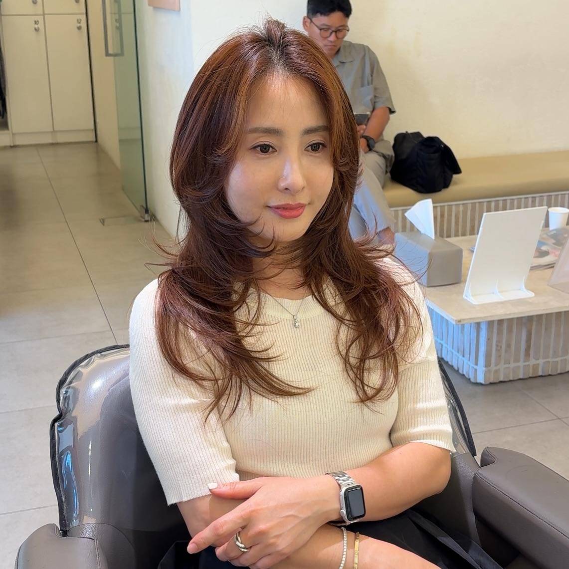 也正是这种设计,让轻熟卷跳出了“显老”的误区——它的卷度是“流动”的,而非固定的纹理,即便是深色系发色,也能在层次的衬托下透出通透的质感。