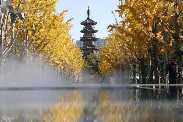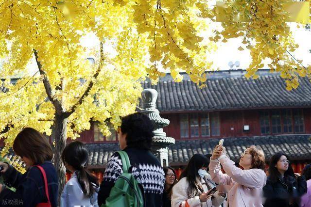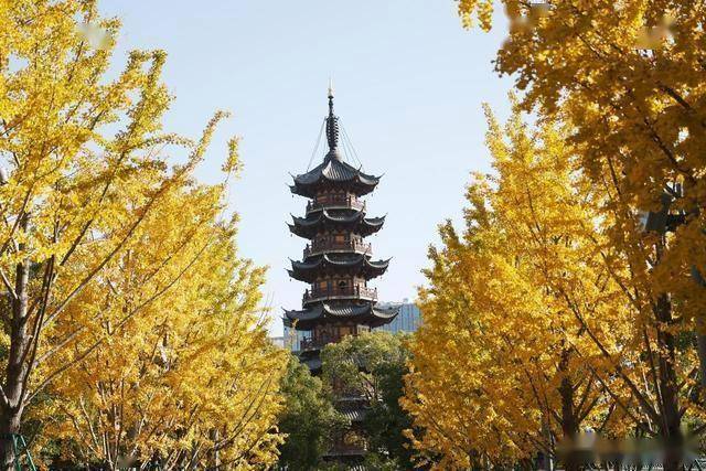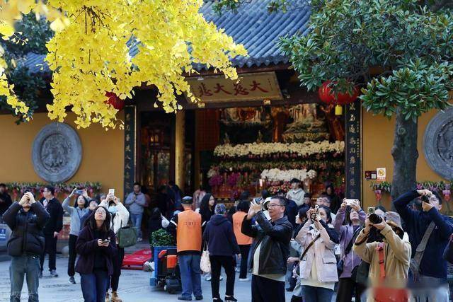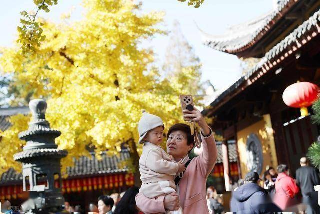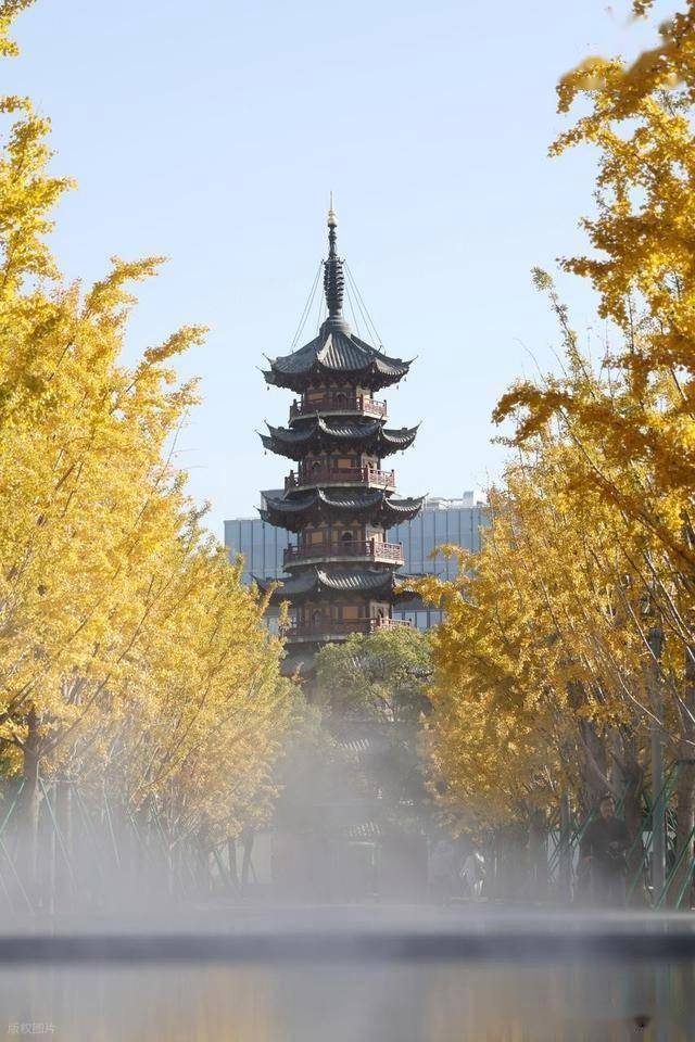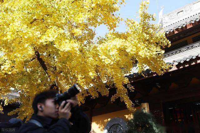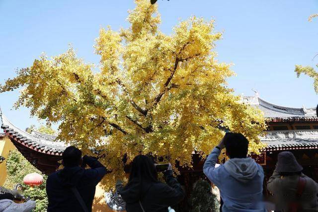 如果说黄金城道是浪漫的代表,那龙华寺的银杏就是典雅与庄重的结合。龙华寺作为上海历史最悠久的古刹之一,寺前广场上的两排银杏树,已经有上百年的树龄了。高大的银杏树整齐排列,金黄的叶片在红墙黛瓦的映衬下,显得格外有韵味。