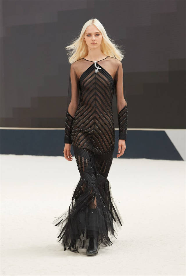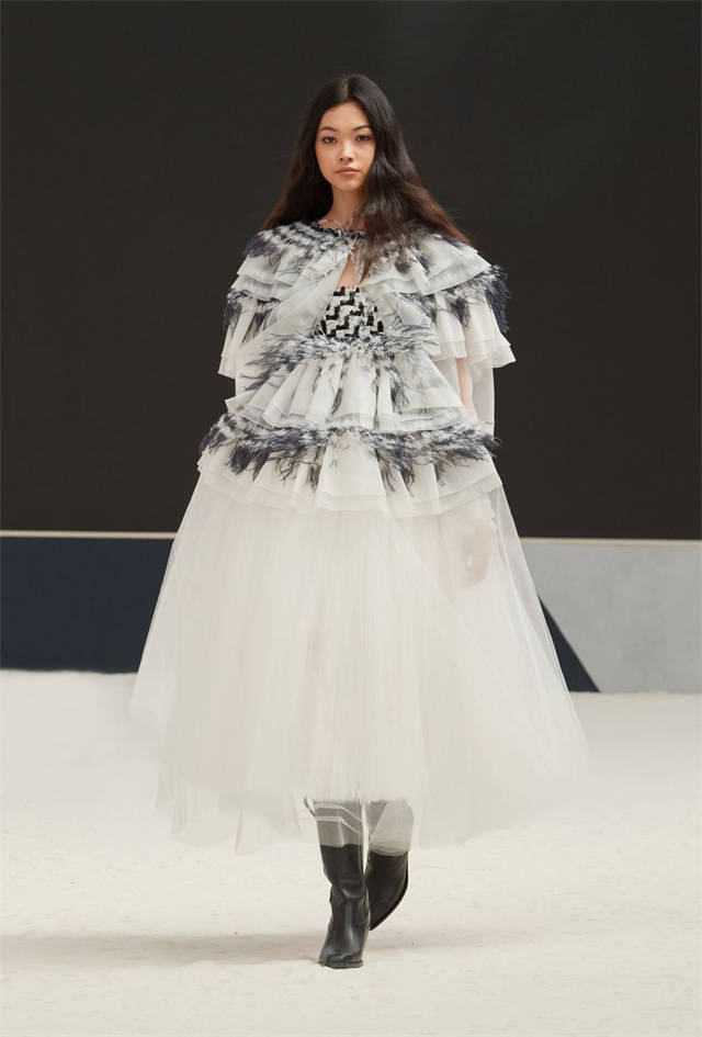 薄纱设计的女人味风格,从肩膀到袖子的蓬松造型,带着复古的羽毛装饰、和刺绣,以及支撑 ,使Chanel 的工艺也大放异彩。