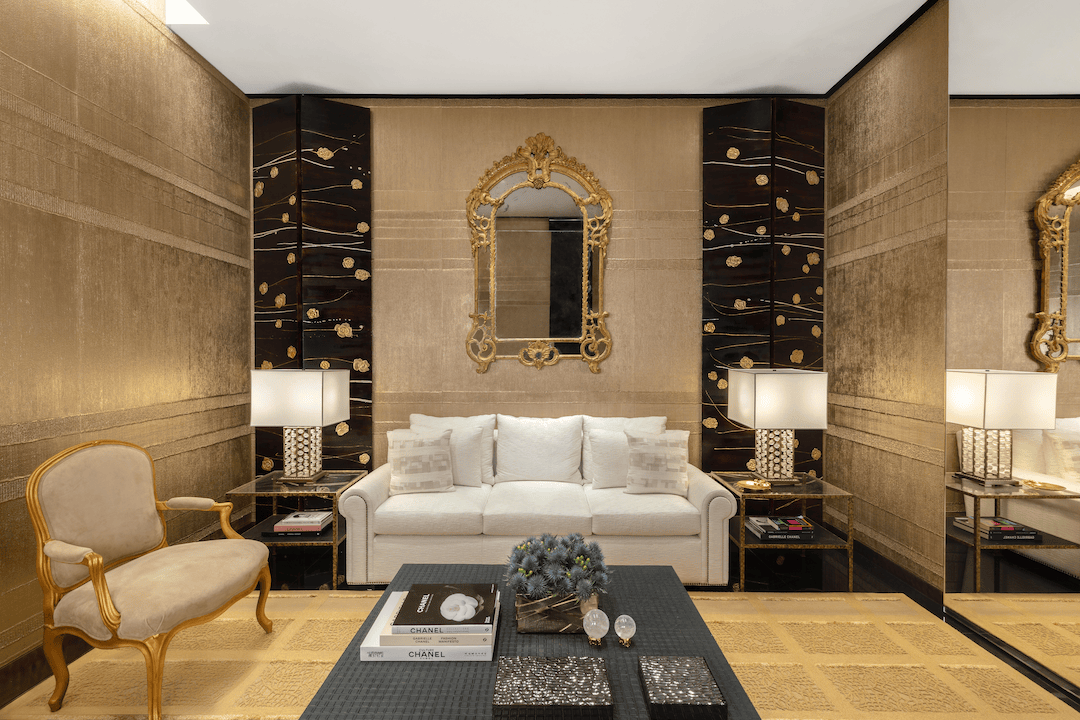 如梦境般华丽,细节极为考究,墙面装饰黑色漆面木质屏风,沙发与座椅包裹着精美的斜纹软呢,以金线编织。