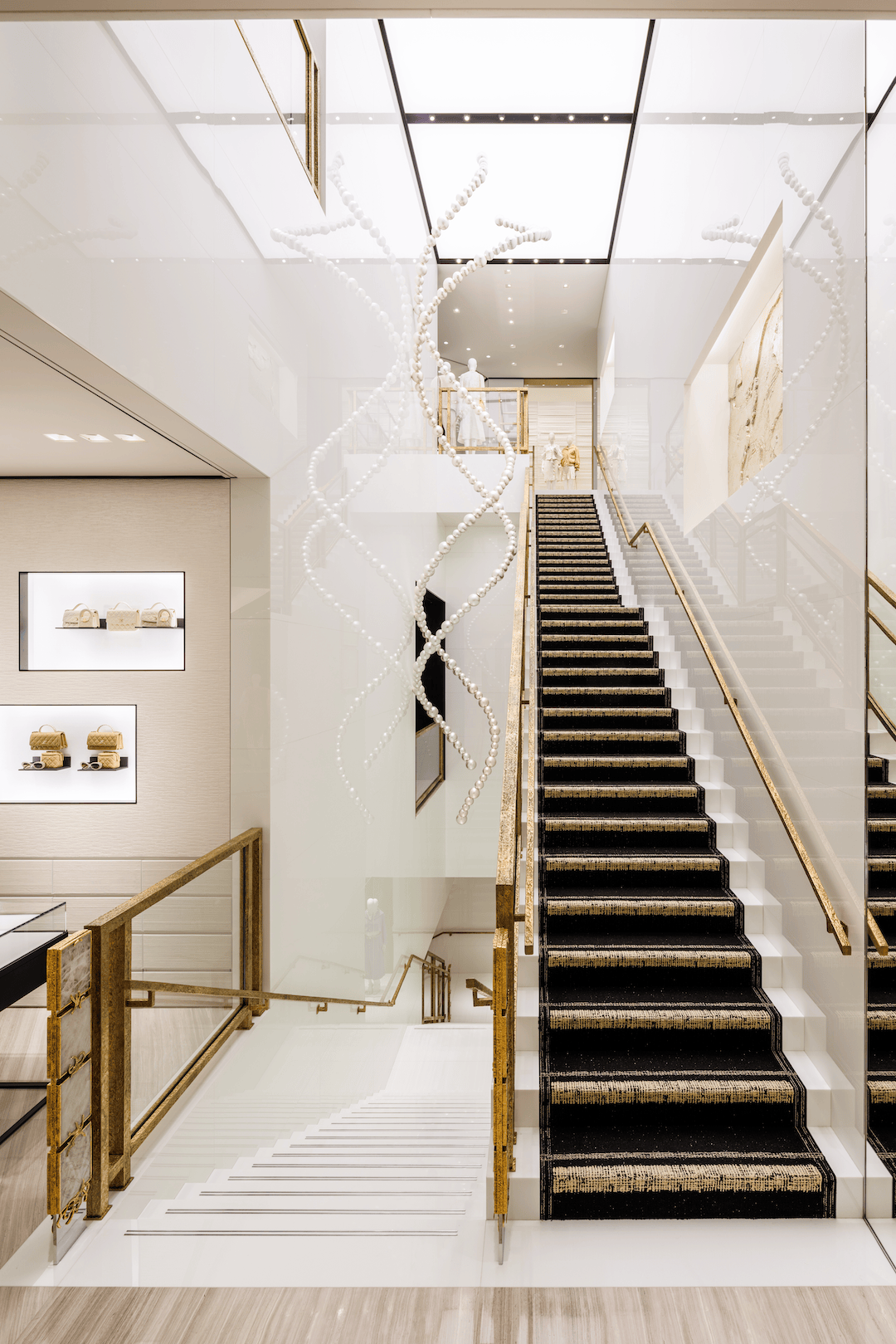 法国当代艺术家Jean-Michel Othoniel为精品店特别创作了珍珠造型雕塑作品,“White Gold Ribbons”,丝带一般蜿蜒,悬浮纵贯三层空间,透过店铺二楼整面落地玻璃窗看过去,气势恢弘。