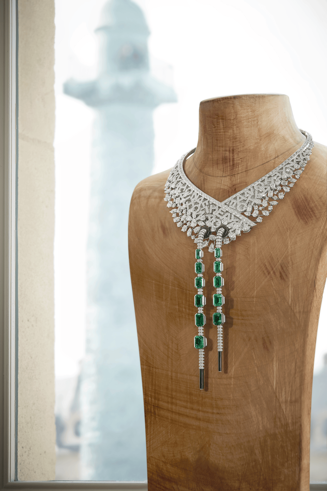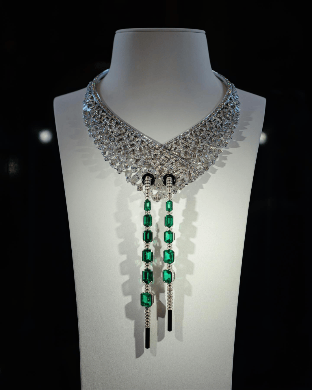 项链的造型仿佛是运动抽绳帽衫,以白金、铂金和缟玛瑙打造,镶嵌11颗总重37.18克拉祖母绿。香奈儿特别研发出一款名为“运动抽绳”的管状链条,以黑漆小圆柱收尾,像极了运动衫抽绳的末端。