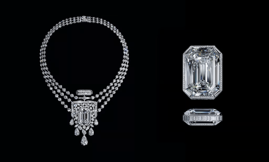 从香水瓶、液滴到香气展开解构,在具象与抽象之间驰骋。这一系列最引人瞩目的作品是一件轮廓如香水瓶般的项链,核心钻石恰好重55.55克拉,美仑美奂、价值连城,被香奈儿品牌传承部收藏。