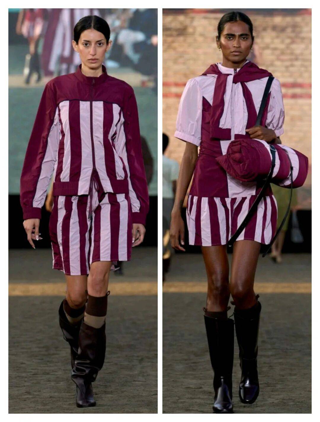 粉紫色颜色和枣红色颜色之间的搭配中,色彩的对比在强烈的色彩对比中,也增加了条纹图案的简约经典的气质,也在和纯色之间的拼接搭配上,带来了不少休闲的潮范儿,而条纹短裤的款式也多了一些休闲日常的时尚。