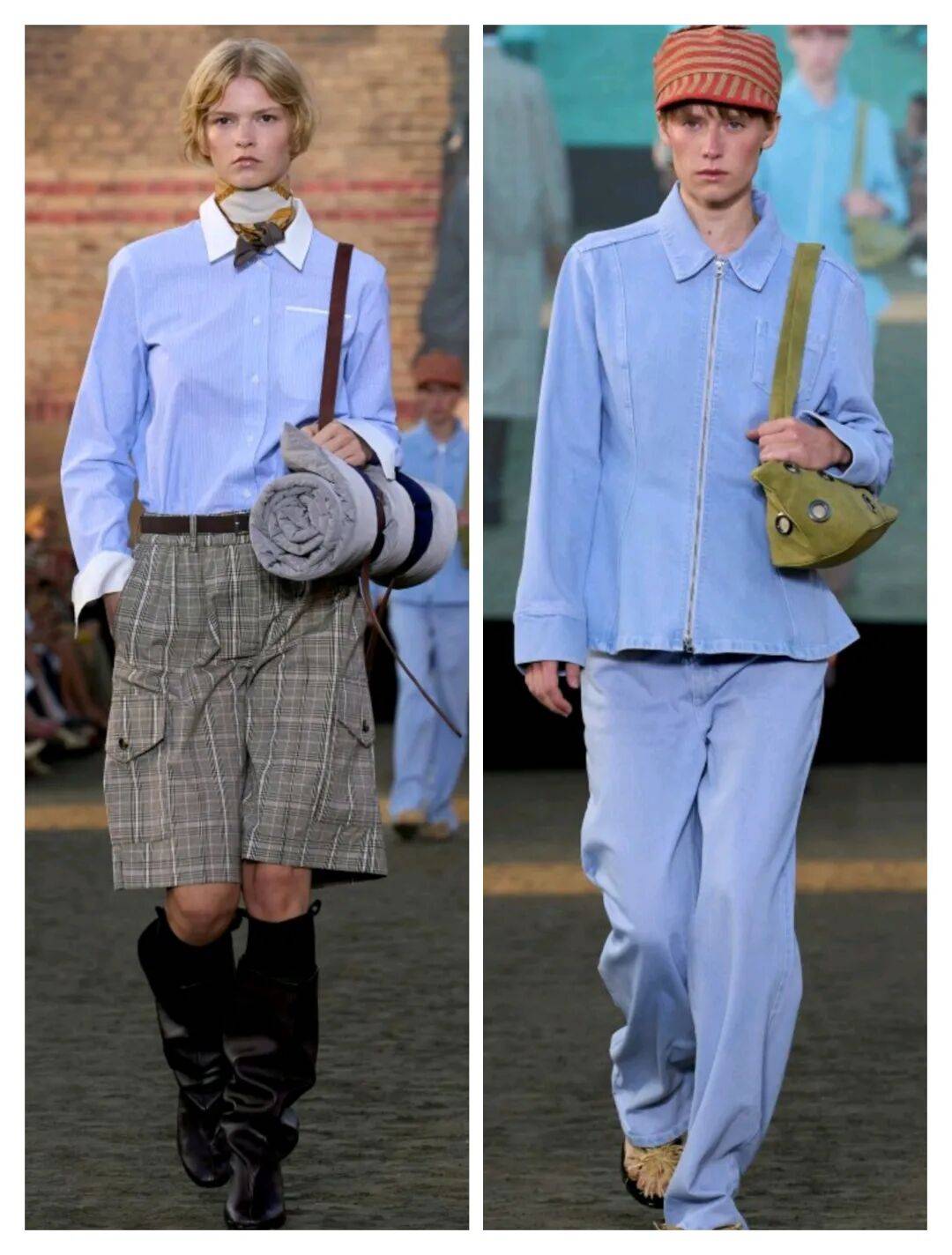 靓丽的浅蓝色颜色在服装上,在这些色彩上气质清新柔和,也在拼接线条、小面积白色等这些的装饰搭配中,在细节的装饰有着更多的时尚设计感,而在深色包包的搭配,为这些造型增加了一些细节的亮点。