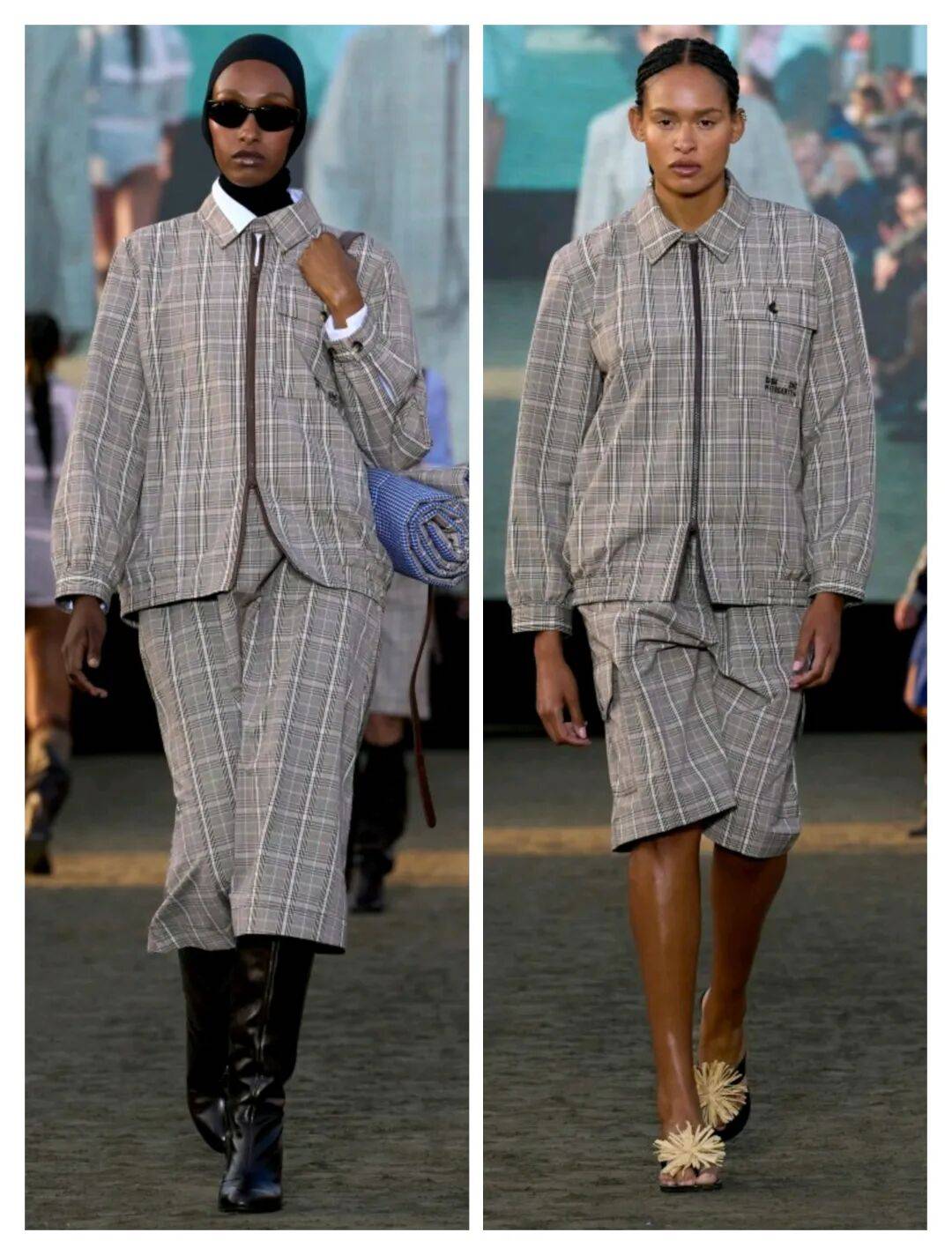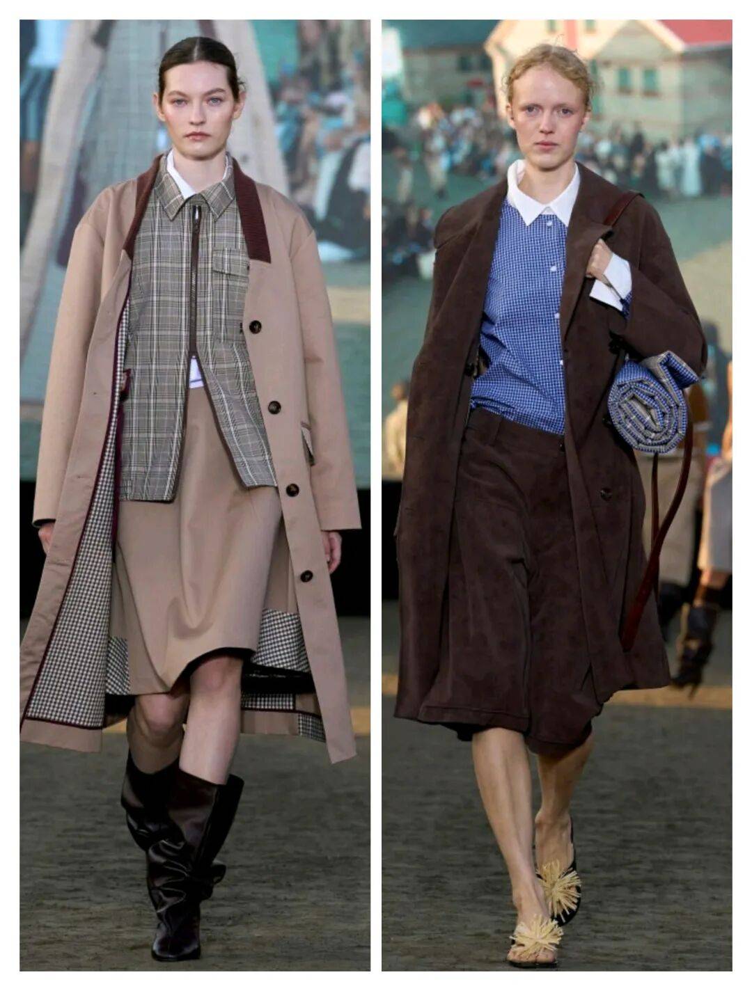 套装款式为主的穿搭之中,也在大衣外套和半身裙、短裤等这些服装之间的搭配中,棕色系的颜色也多了不少套装的利落优雅,也在一些格纹元素图案的装饰,带来了一些视觉对比,拼接设计和对比层次也彰显了更多的时尚感。