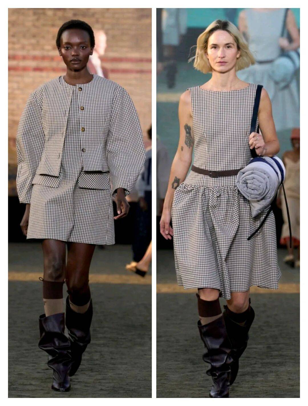 经典的黑白色彩在服装之上,色彩的对比在这些中性色彩的对比搭配中,增加了更多小巧格纹图案的经典复古的时尚感,还在造型感袖子、低腰的拼接等设计,也多了不少廓形线条感,而黑色腰带、黑色堆叠的靴子等这些配饰的搭配中,这些经典格纹为穿搭增加了更多的细节亮点。