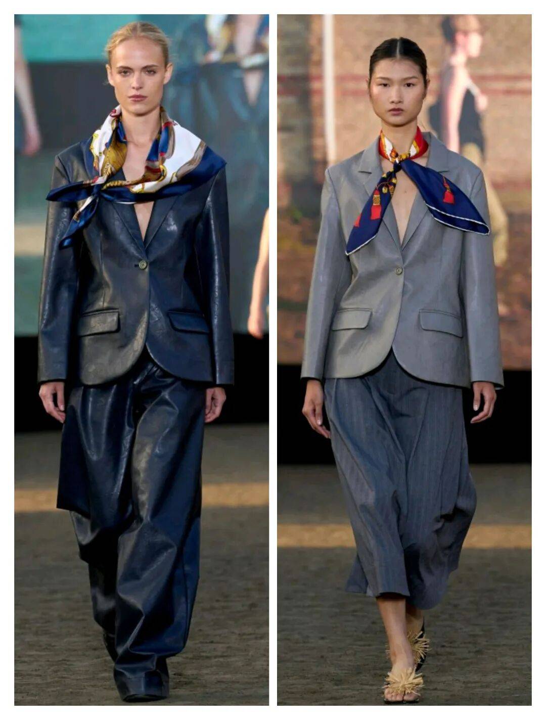 在藏青色和灰色等这些色彩中,气质低调稳重,纯色的简约在光滑的材质中增加了光泽质感,在西服的款式中增加了一些干练的气质,还在领口的位置,打结的花纹丝巾为造型增加了一些吸睛的亮点。