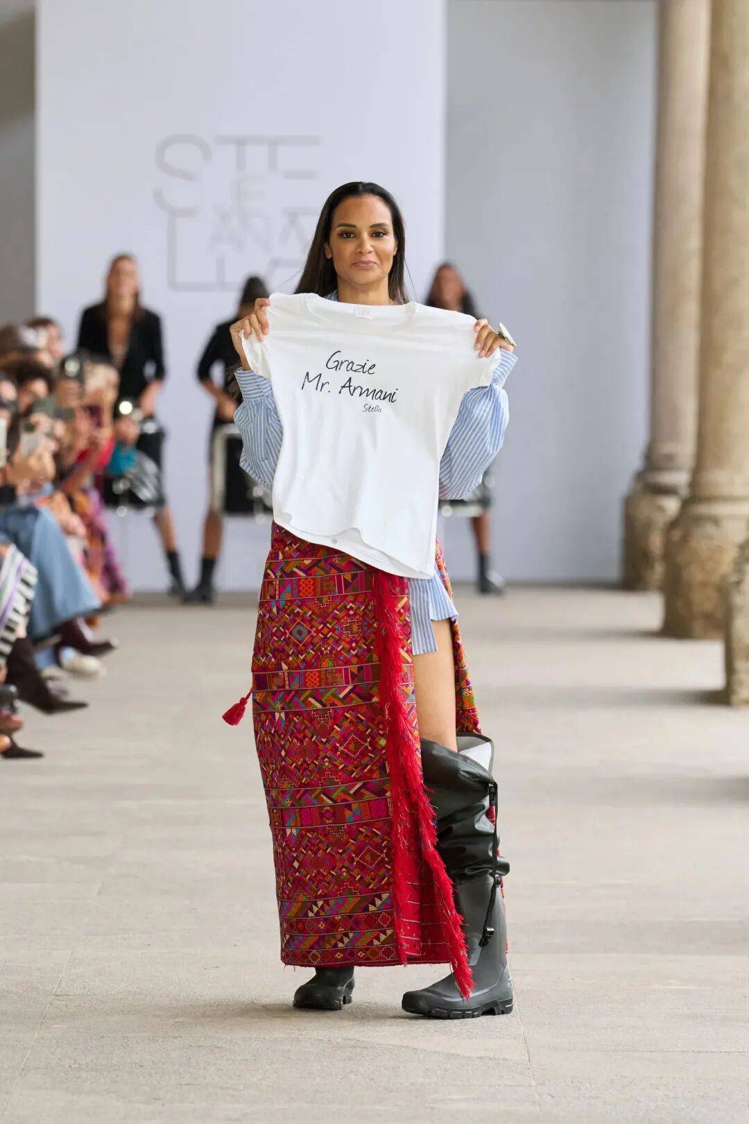 开场造型也是对Giorgio Armani的致敬,正是他精妙的意式剪裁在十多年前发现了Jean的才华,邀请她在Armani剧场展示作品。这场致敬在秀场尾声达到高潮,当Jean谢幕时,她举起了一件印有对Armani感谢词的白色T恤,纪念这位最近去世的设计大师。