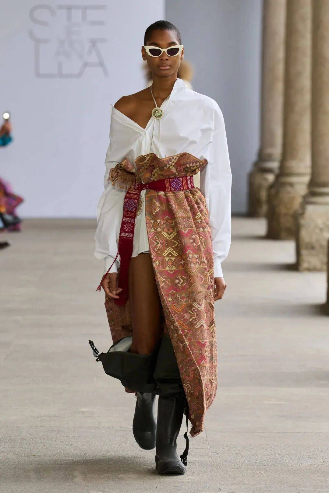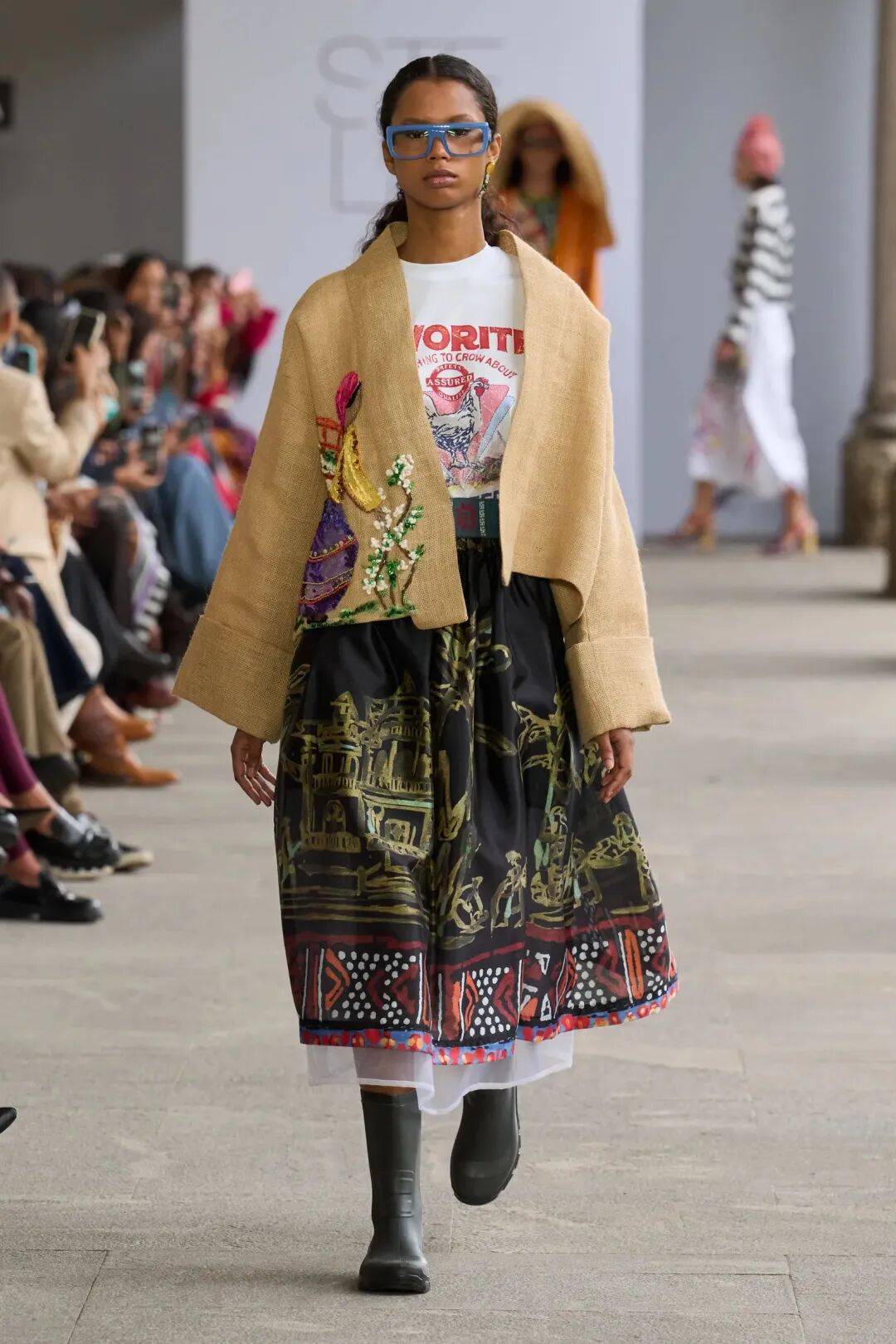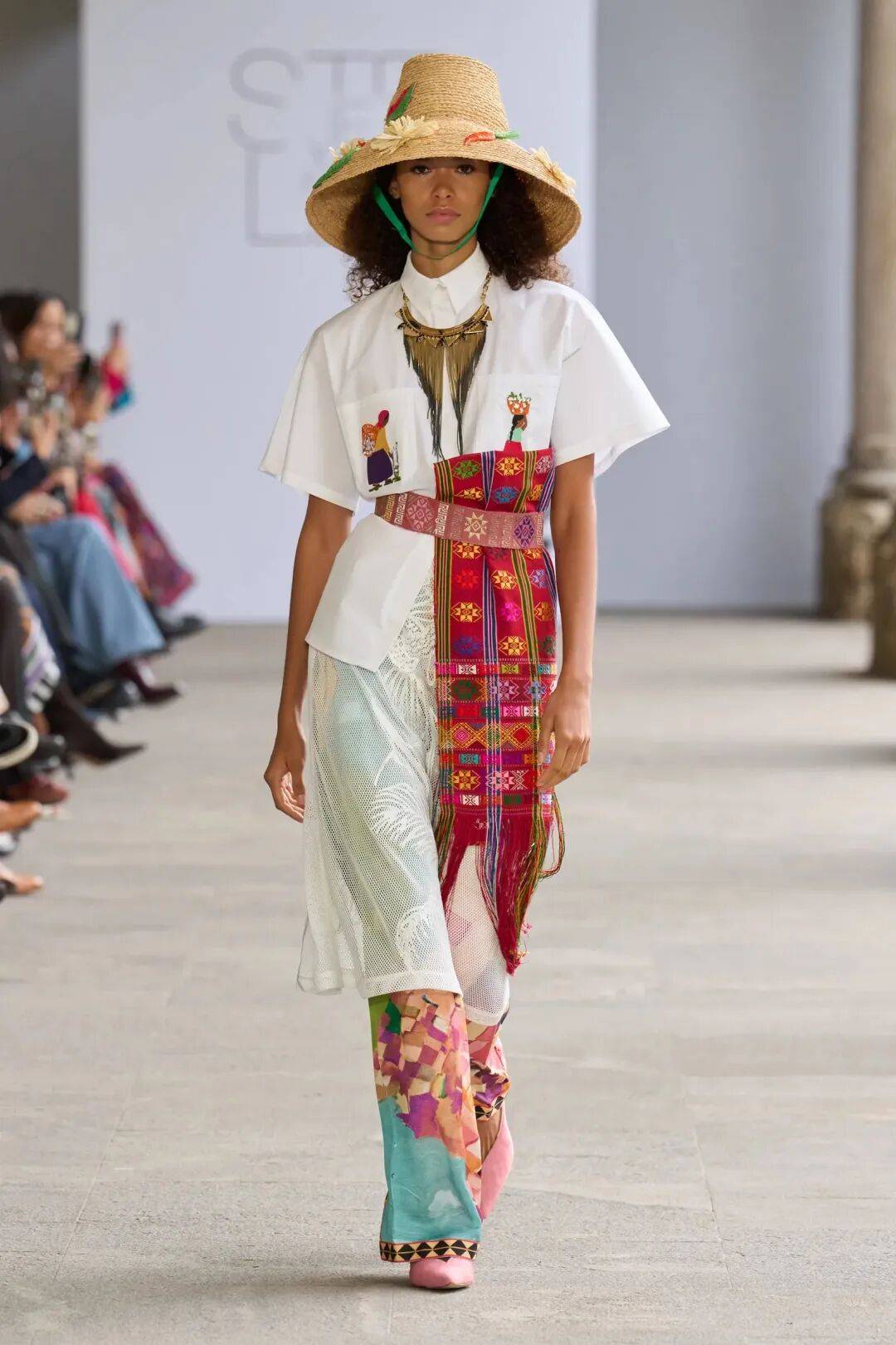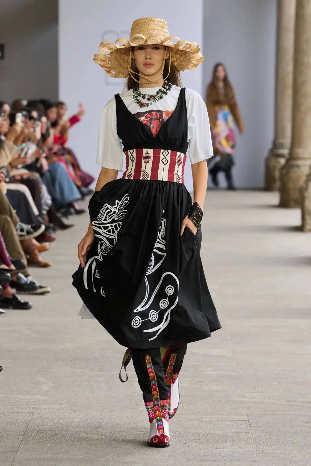 无论是内衬不丹纺织品的大衣,还是搭配结构感夹克的拉菲草裙,都展现了传统与现代之间的持续对话。