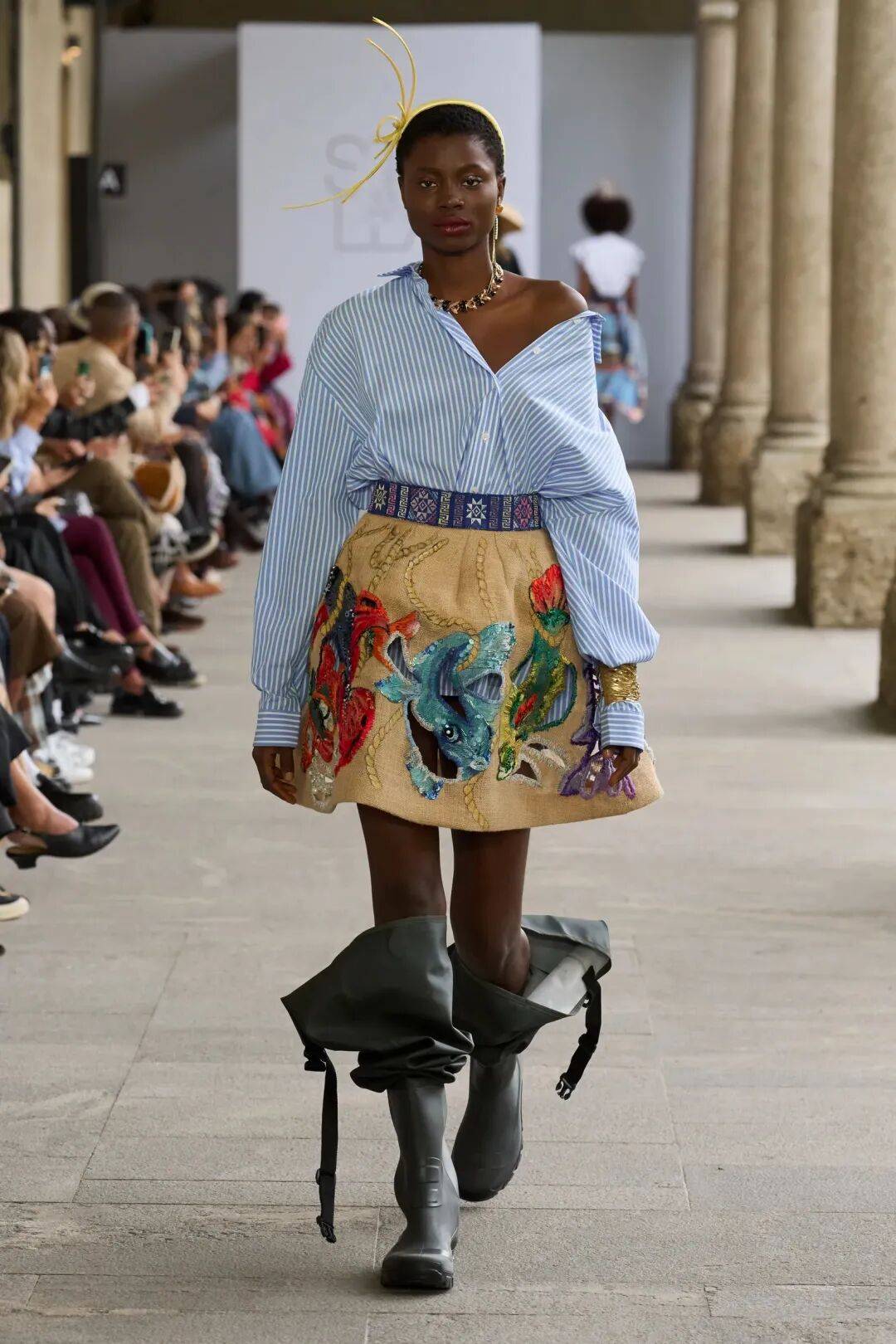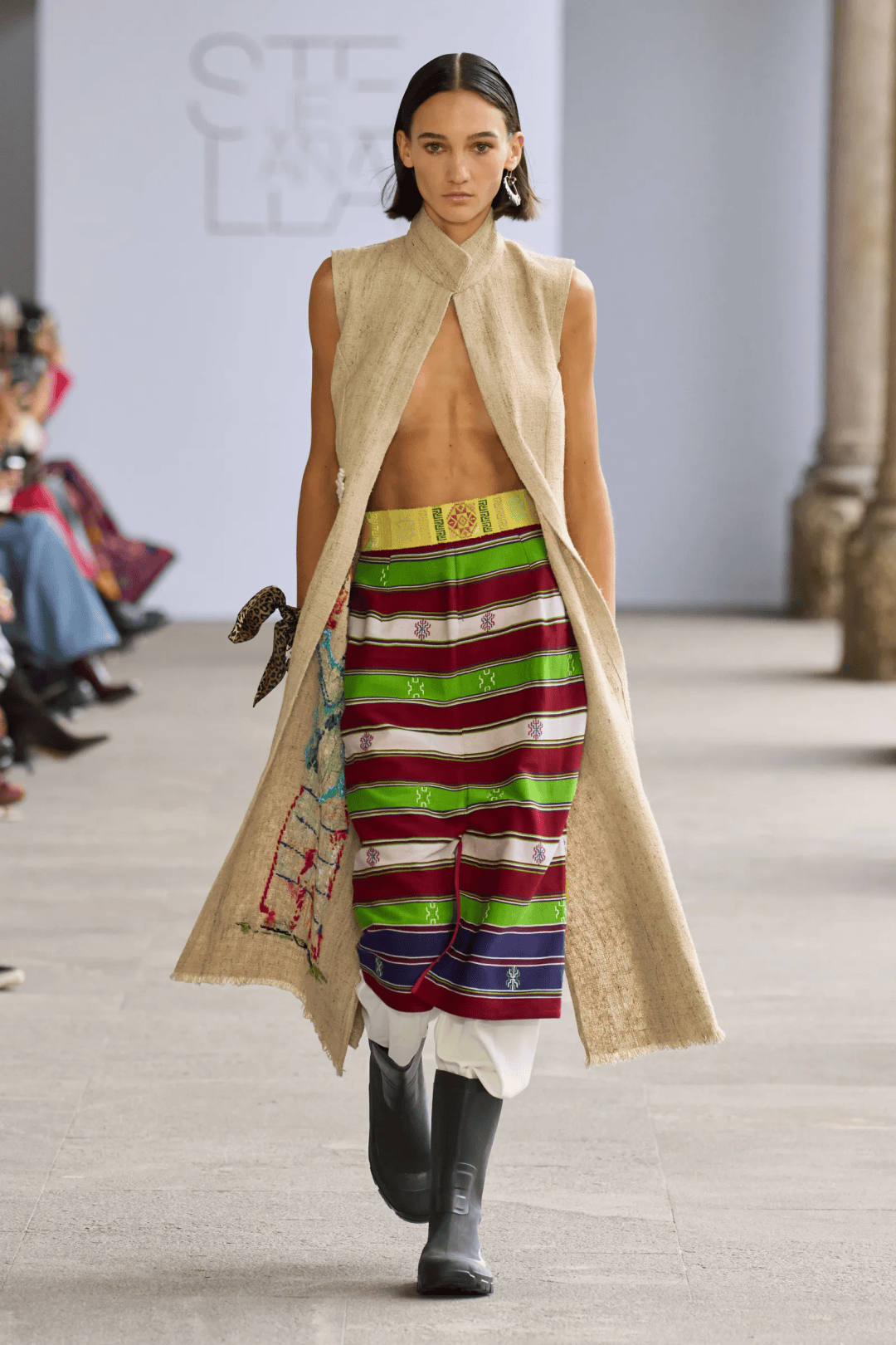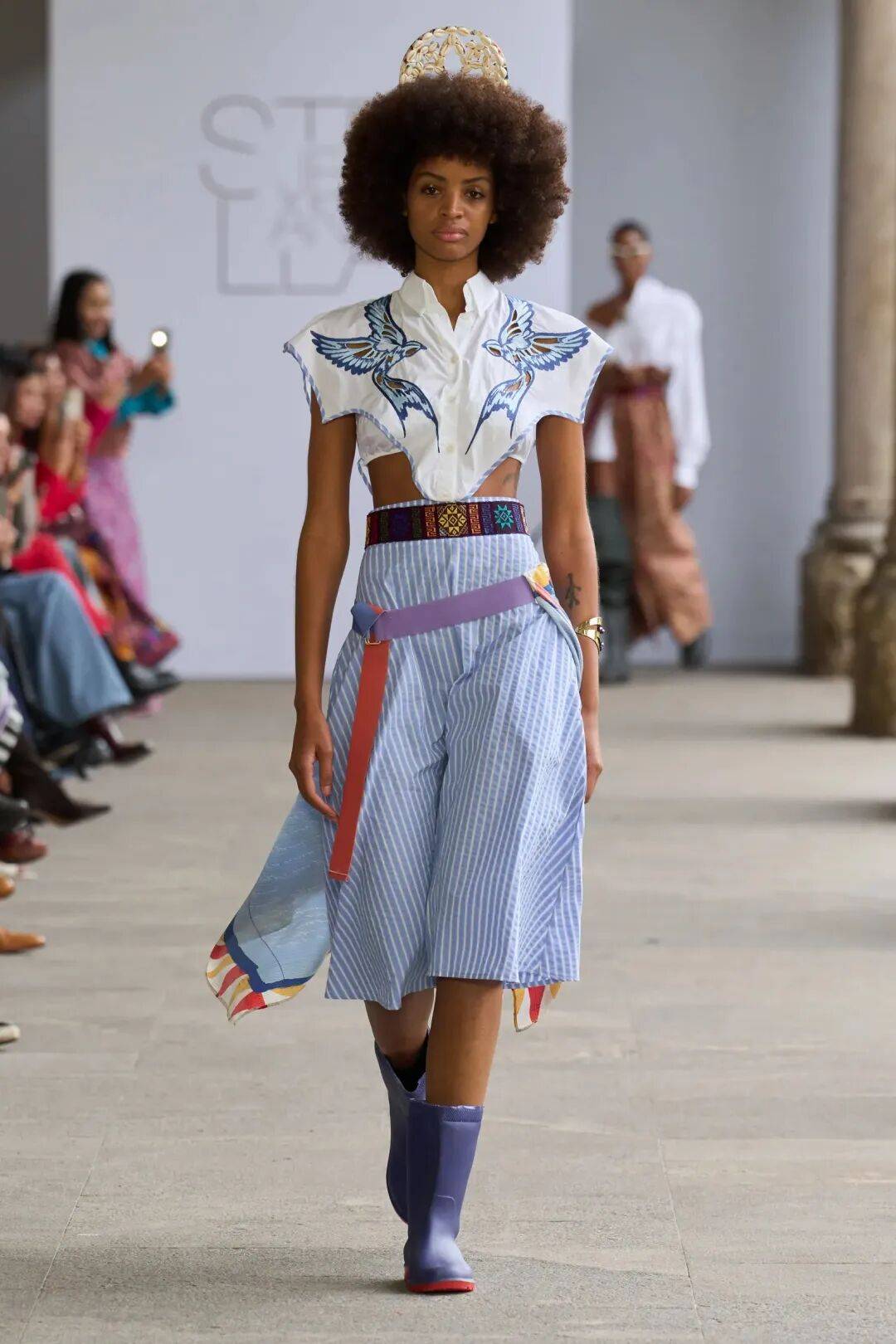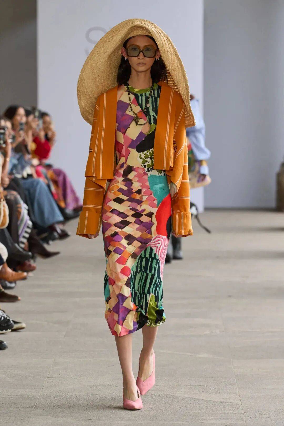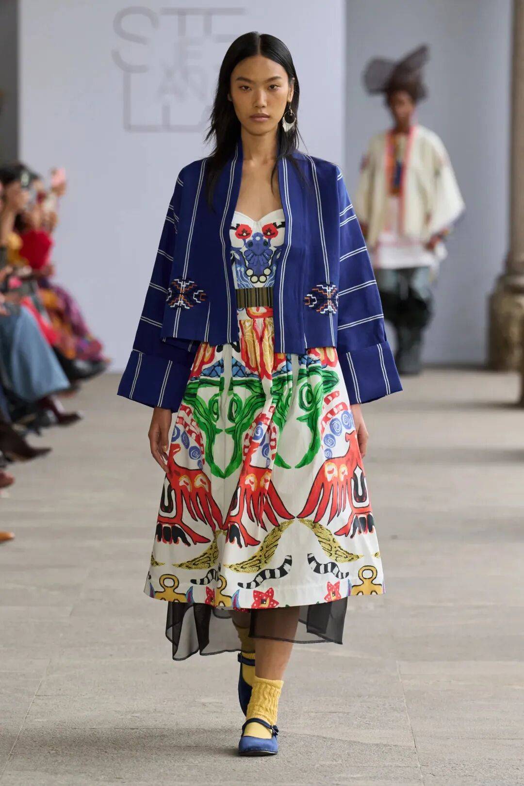 无论是内衬不丹纺织品的大衣,还是搭配结构感夹克的拉菲草裙,都展现了传统与现代之间的持续对话。
