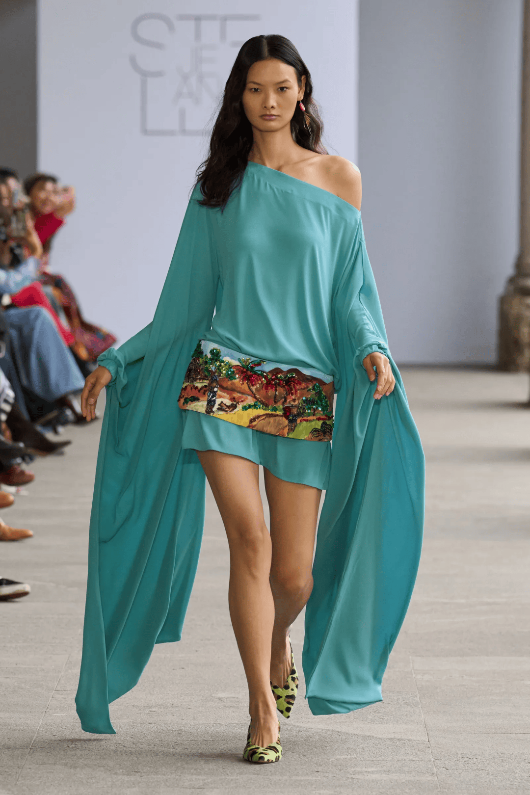 设计师还融入了拉菲草和再生棉等环保材料,以及她在不丹旅行期间搜集的配饰。这些选择既体现了环保意识,又保持了作品的真实性。