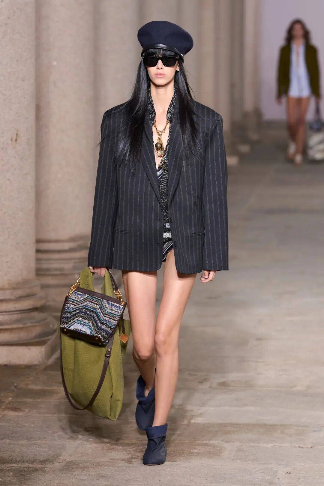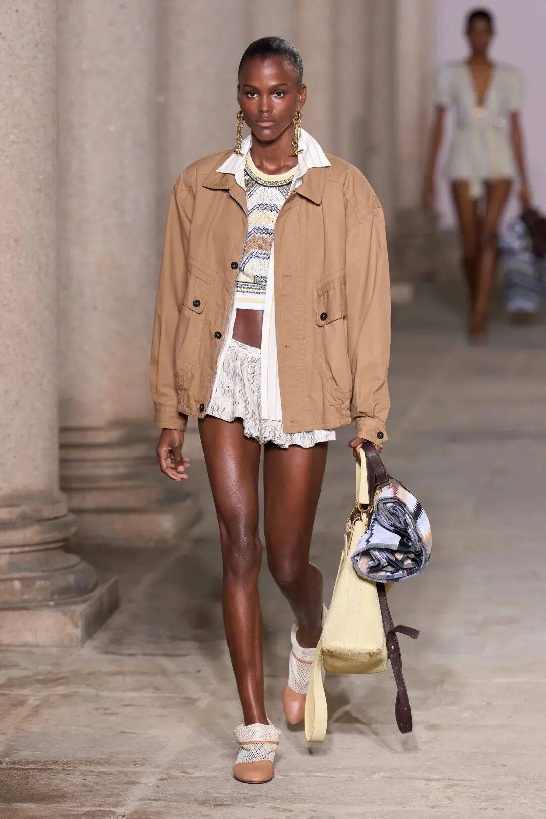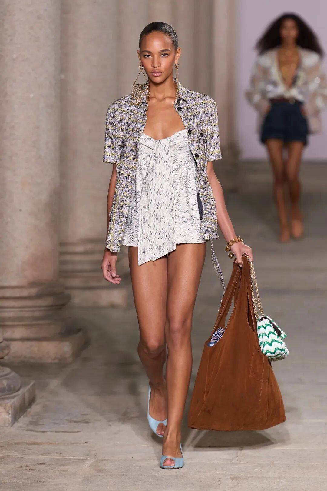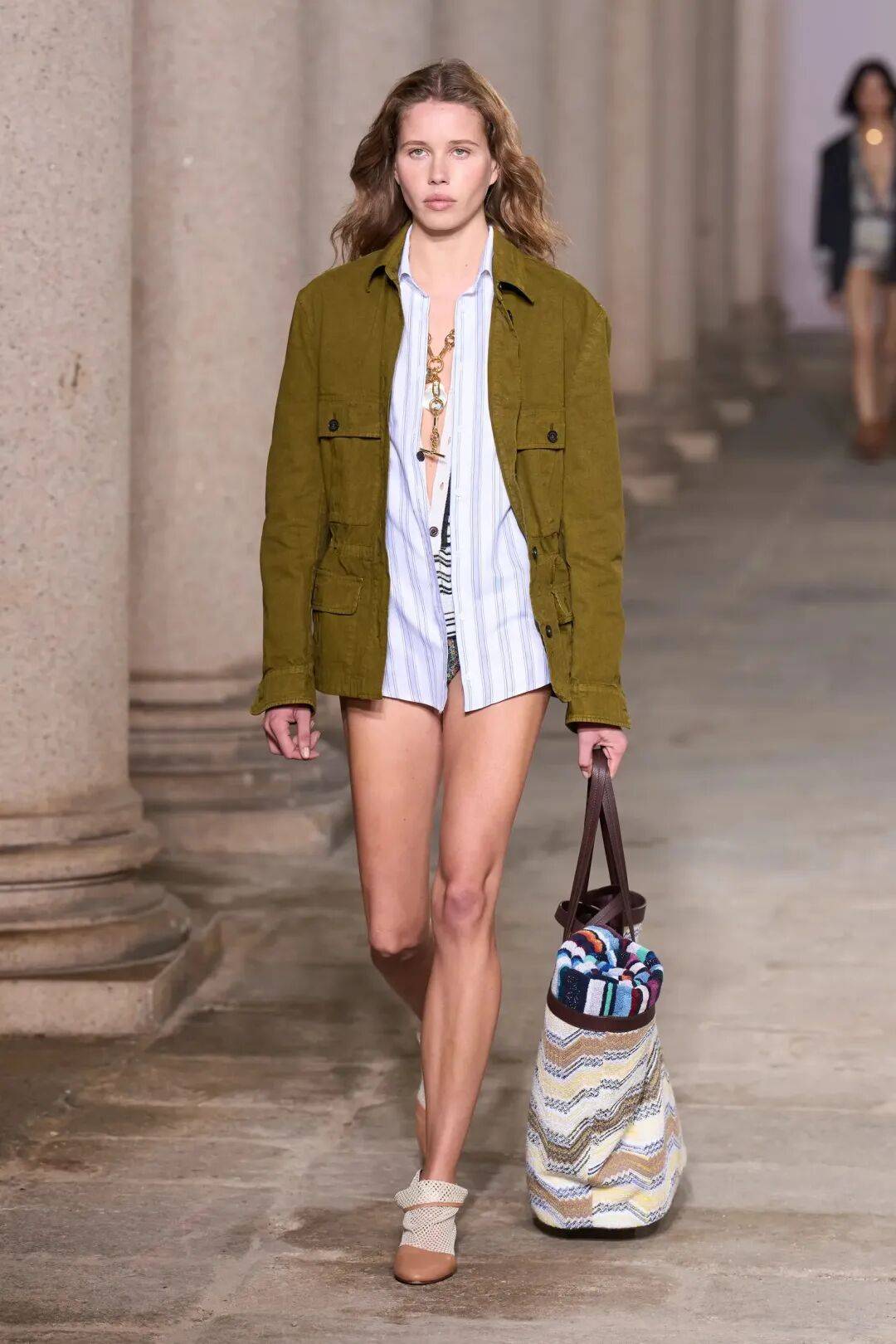 Alberto Caliri以比基尼下装与卷边短裤为画布,用军用夹克的利落线条中和度假风的慵懒,又在亮片上衣与宽版针织开衫的交叠中,创造出昼夜场景的无缝切换。这种“实用美学”的智慧,体现在模特们斜挎的三重编织手袋——拎包组合里装着叠好的沙滩毛巾,看似随性的叠戴,实则是品牌对现代度假生活方式的敏锐洞察:自由,从不是单一选择,而是多重可能性的并存。