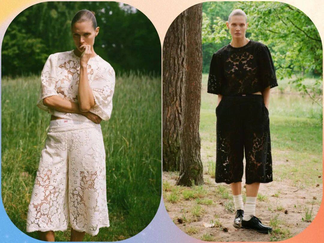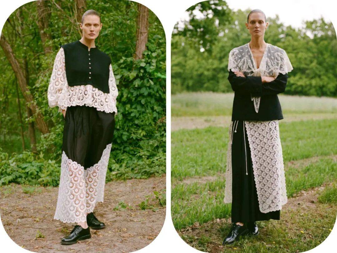 经典的黑白两种颜色在中性色的色调中,气质简约也更为大方,在纯色的极简中,以蕾丝的面料增加了一些材质的纹理质感,还在廓形中多了一些小性感的气质;将镂空设计和花纹图案进行结合,为休闲套装增加了不少的活力气质。