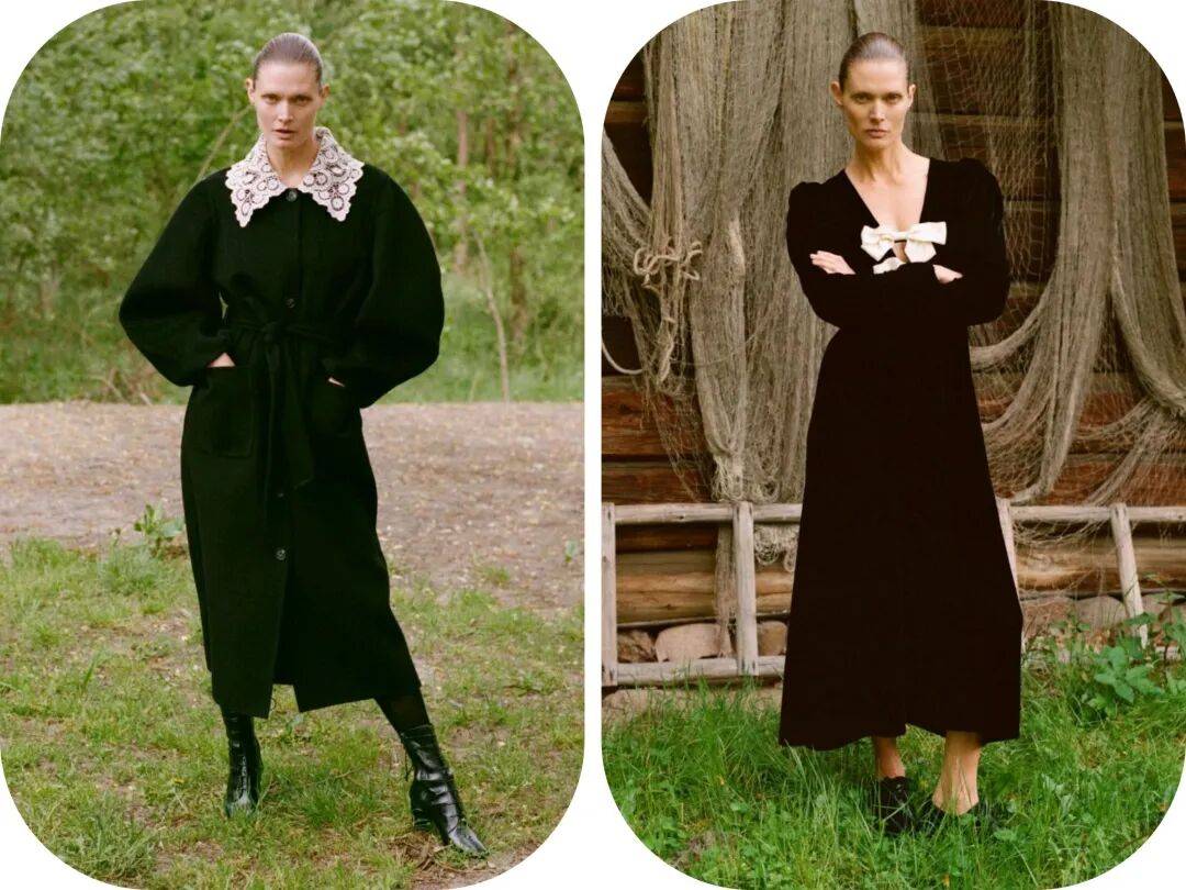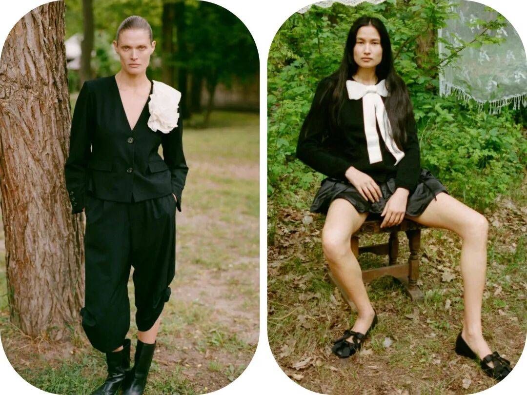 黑色的上衣在白色的出现中,白色的袖口、白色的蝴蝶结等这些元素,为黑色的上衣增加了一些撞色的亮点;而裙装在优雅温婉的气质中,轻薄的薄纱材质,也多了朦胧飘逸的视觉。