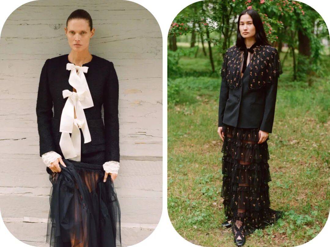 黑色的西服元素的上衣在薄纱衣领、荷叶边的薄纱裙等这些的款式之中,以质感增加了隐约的时尚。