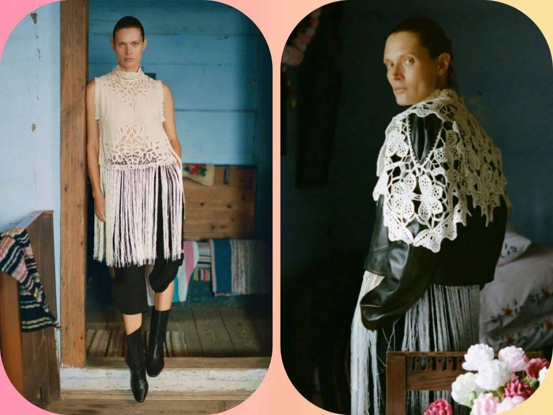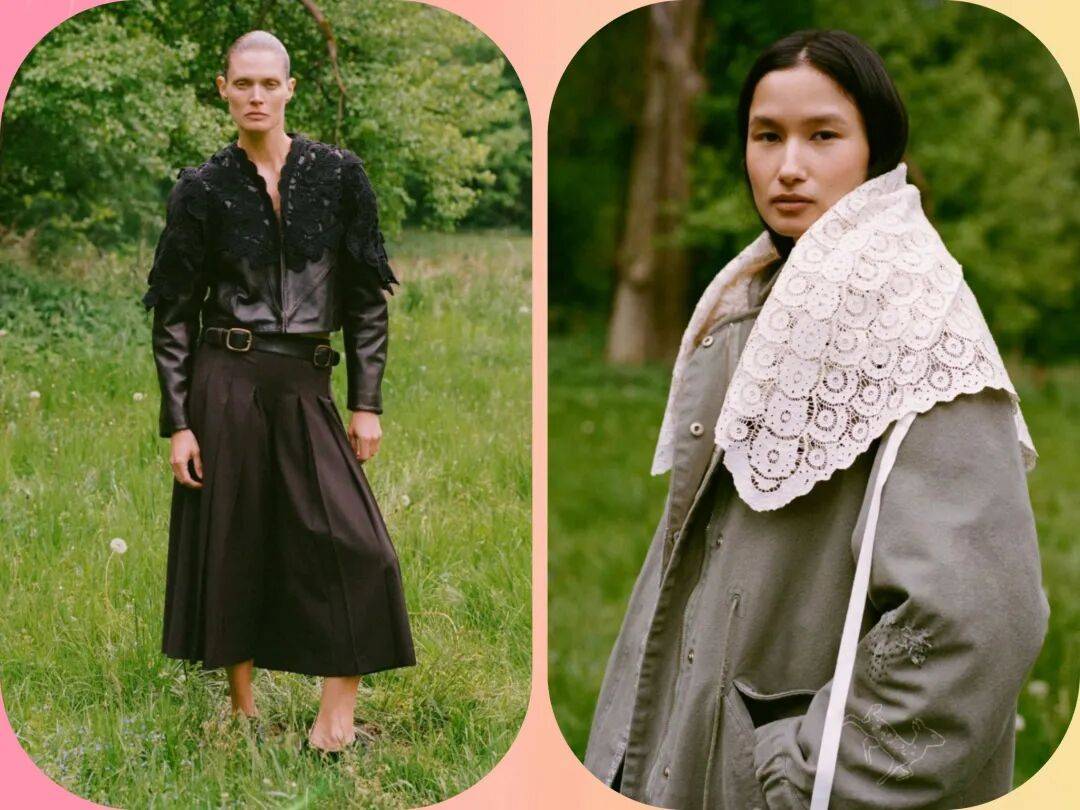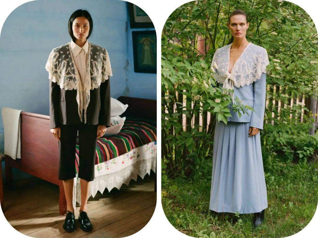 宽大的夸张衣领在带着一些透感的镂空材质中,将更多的视线和设计感集中在 了衣领的位置,而在休闲外套之间的搭配中,让这些服装有着休闲的时髦。