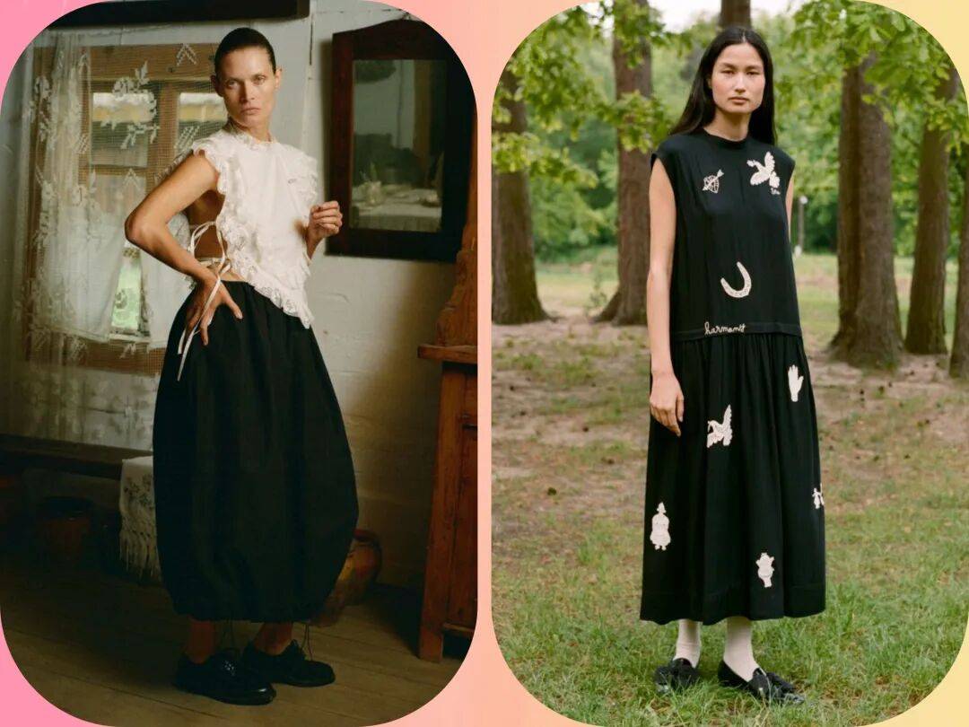 无袖的款式在背心、连衣裙等这些的服装中,经典黑白色彩之间的对比搭配,也在拼接的荷叶边、花纹图案、打结系带等这些设计的出现,丰富了设计细节。